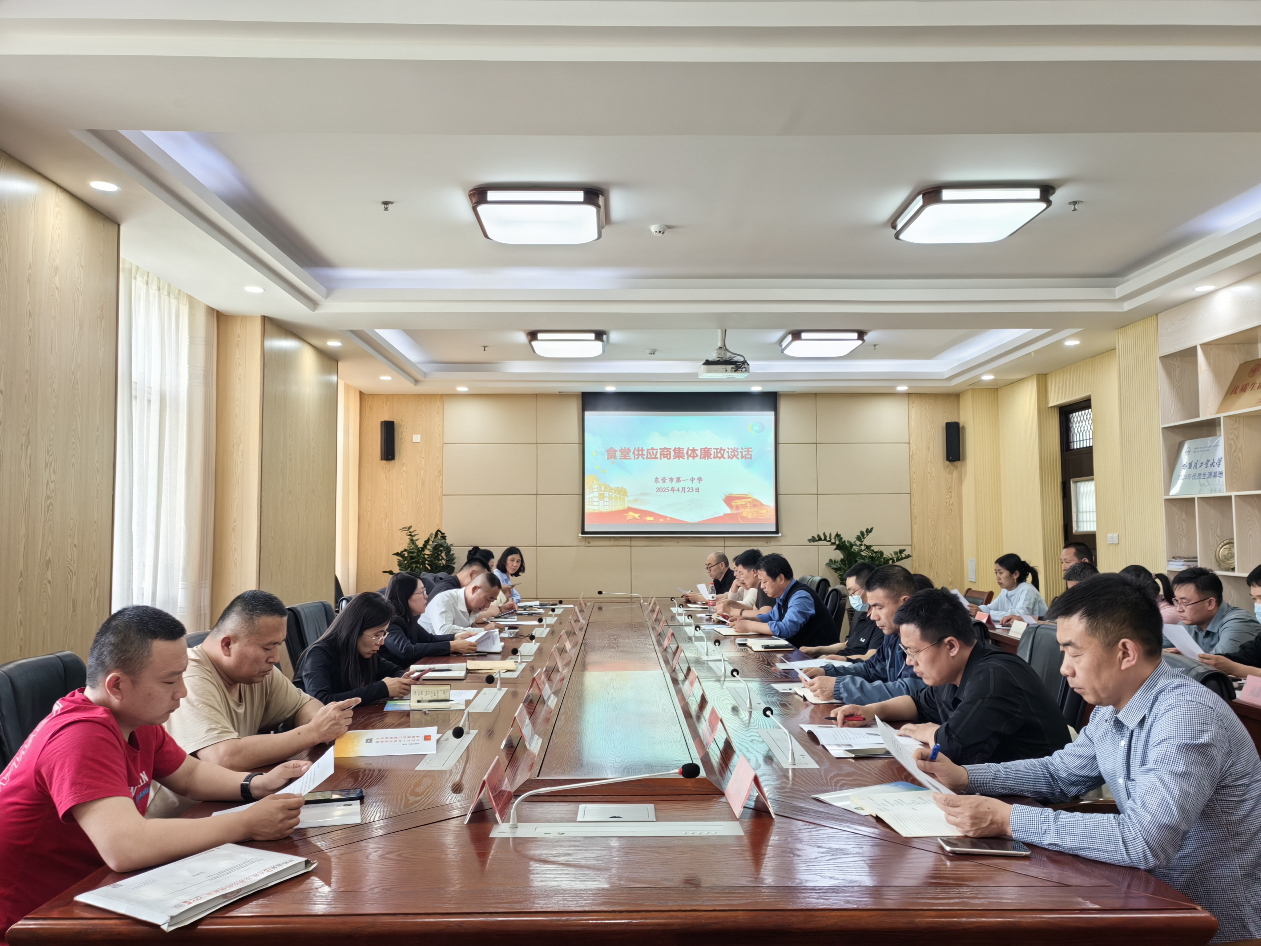 为扎实推进清廉学校建设,认真做好餐饮安全保障工作,4月23日,市一中召开食堂供应商集体廉政谈话。学校纪委书记宋海英、纪委副书记宋晖及食堂全体供应商参加本次会议。