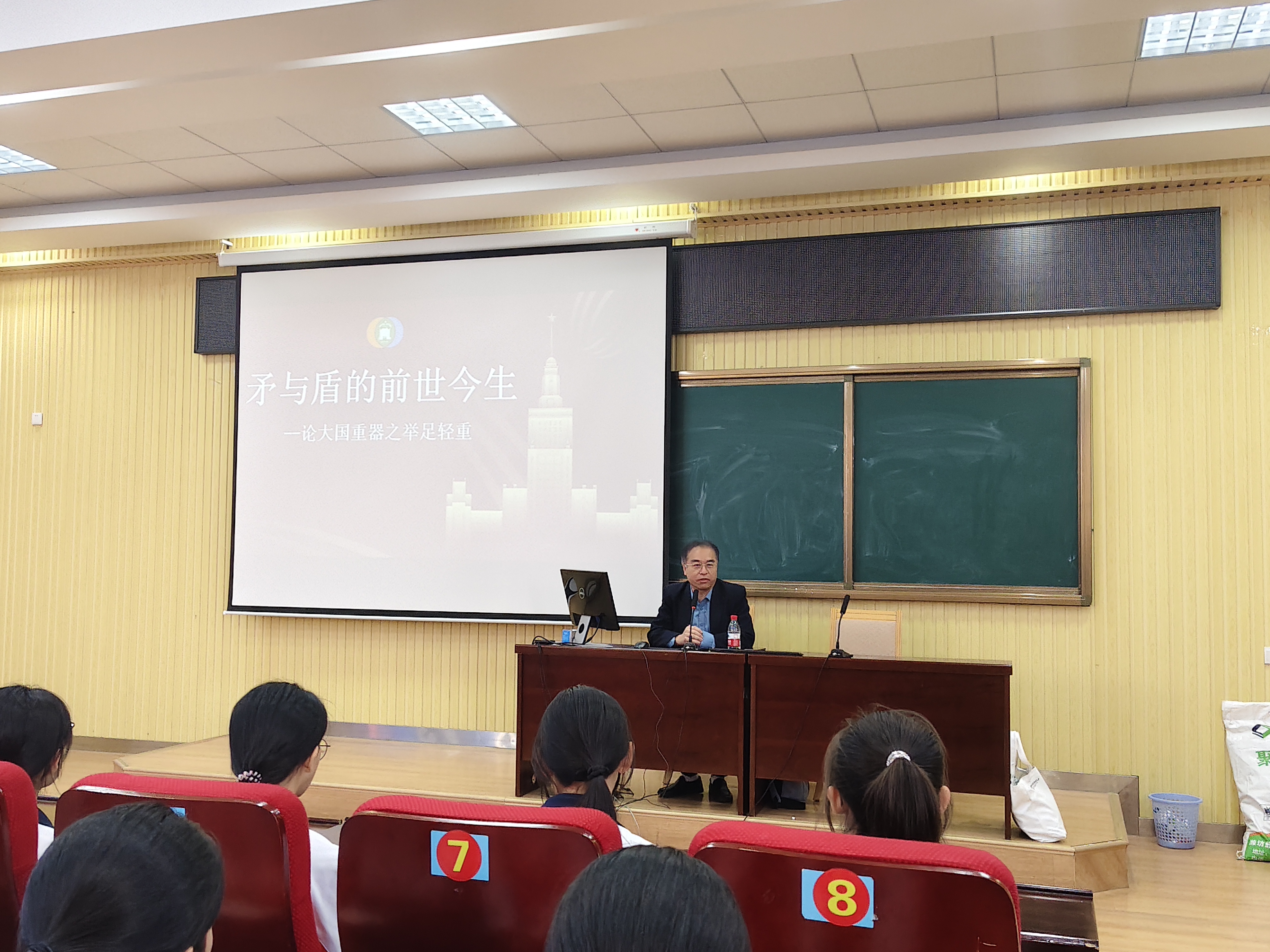 座谈结束后,精彩的科普讲座在光兴楼阶梯教室举行。深圳北理莫斯科大学的李树奎教授为我校师生带来了一场题为《矛与盾的前世今生》的精彩讲座。讲座以“人类的历史是一部战争史”为切入点,层层递进,深入剖析了全球化背景下的材料发展历程与趋势。李树奎教授凭借深厚的学术功底与生动的讲解方式,将复杂的材料科学知识以通俗易懂的语言呈现给师生,现场气氛热烈,互动频繁。讲座不仅拓宽了师生们的视野,更激发了大家对材料科学领域的探索热情。