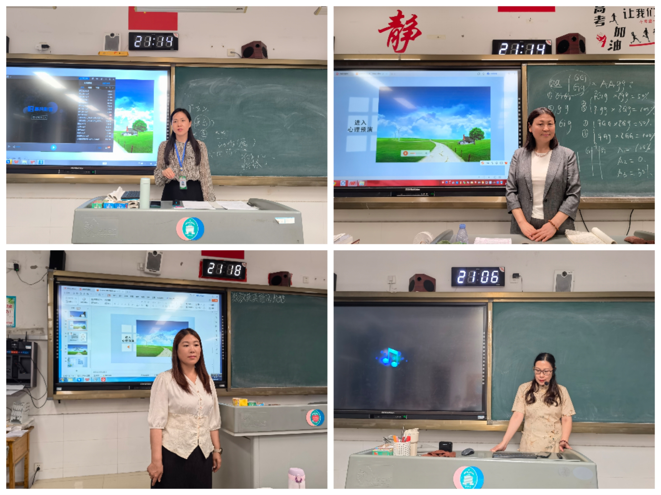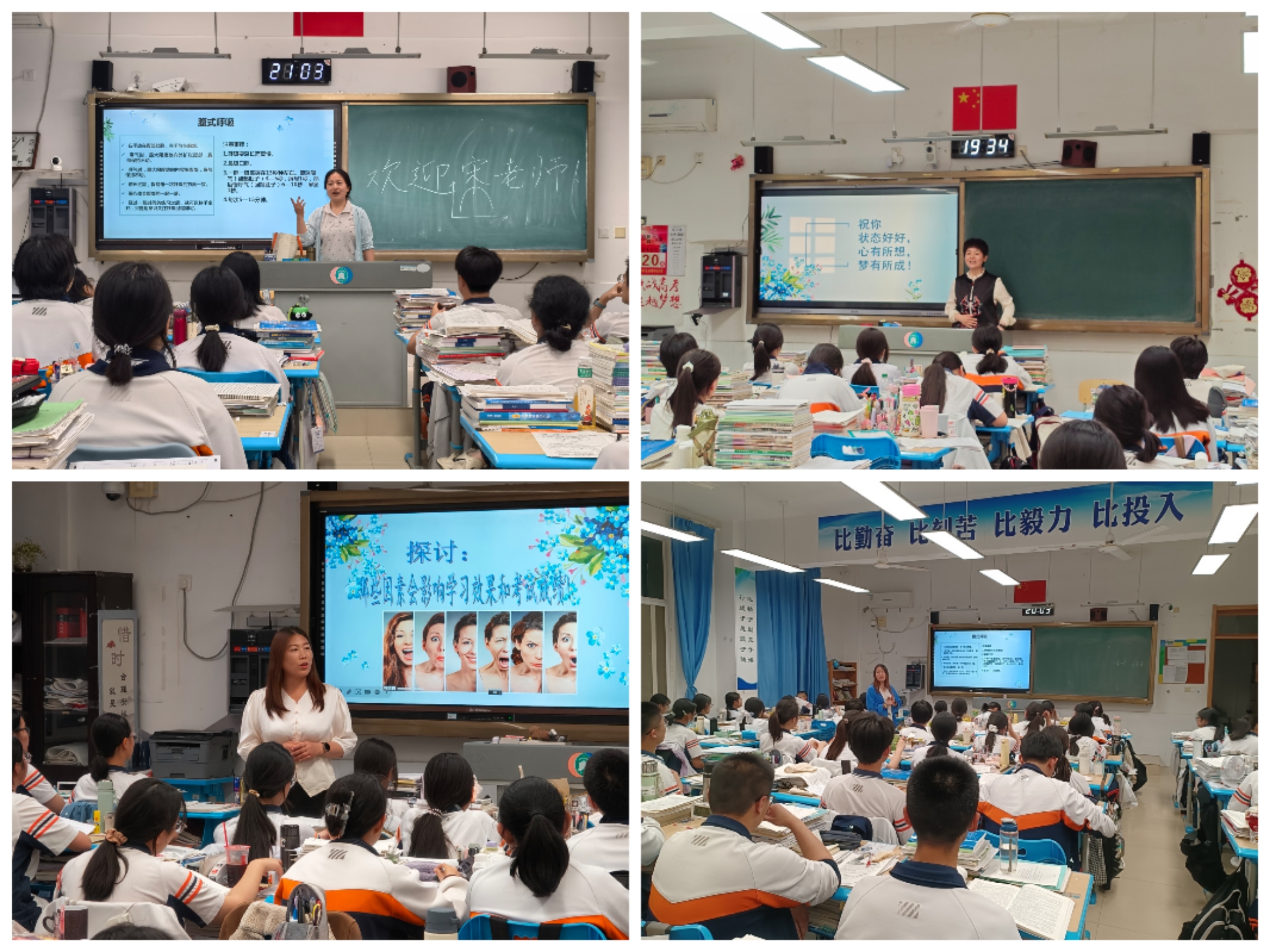心理课上,老师们从学生自己最关注的高考冲刺前的感觉引导学生关注自我内心感受,然后告诉学生,除了身体状态、关系状态,情绪状态也是影响学习效果和考试成绩的因素。从而提醒学生学会渐进式肌肉放松和腹式呼吸,先从身体上找到不紧绷的感觉;然后进行乐观的心理预演,可以辅助蝴蝶拍等小技巧,给自己积极的心理暗示。