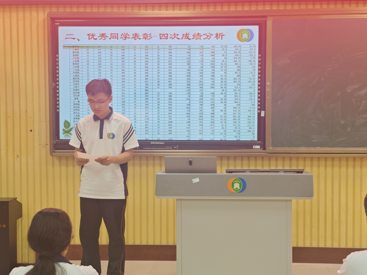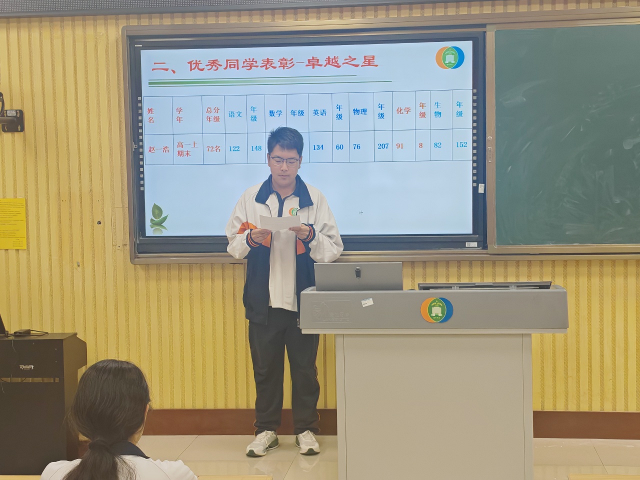 刘文星老师以“须知少时凌云志,曾许人间第一流”为班会主题,他首先分析了班级总体学习情况。各科平均分均保持较高水平,展现了班级扎实的学习基础。通过四次阶段性成绩的纵向对比,班级整体呈现稳中有进的趋势。随后,刘老师宣读了班级的“卓越之星”“单科之星”和“进步之星”名单,鼓励所有同学向先进榜样看齐,同时以钱伟长、华罗庚等科学家的奋斗事迹激励学生,强调“勤奋是制胜法宝,信仰是成功基石”,呼吁学生以坚定的想信念享受学习过程。本次观摩班会,刘老师安排了班级卓越之星、进步之星和优秀宿舍长代表做了典型发言。他们详细介绍了自己在学习方法、目标设定和碎片化时间利用等方面的经验,通过生动的案例和可操作的技巧,展现了高效学习与自我管理的实践路径。.jpg)