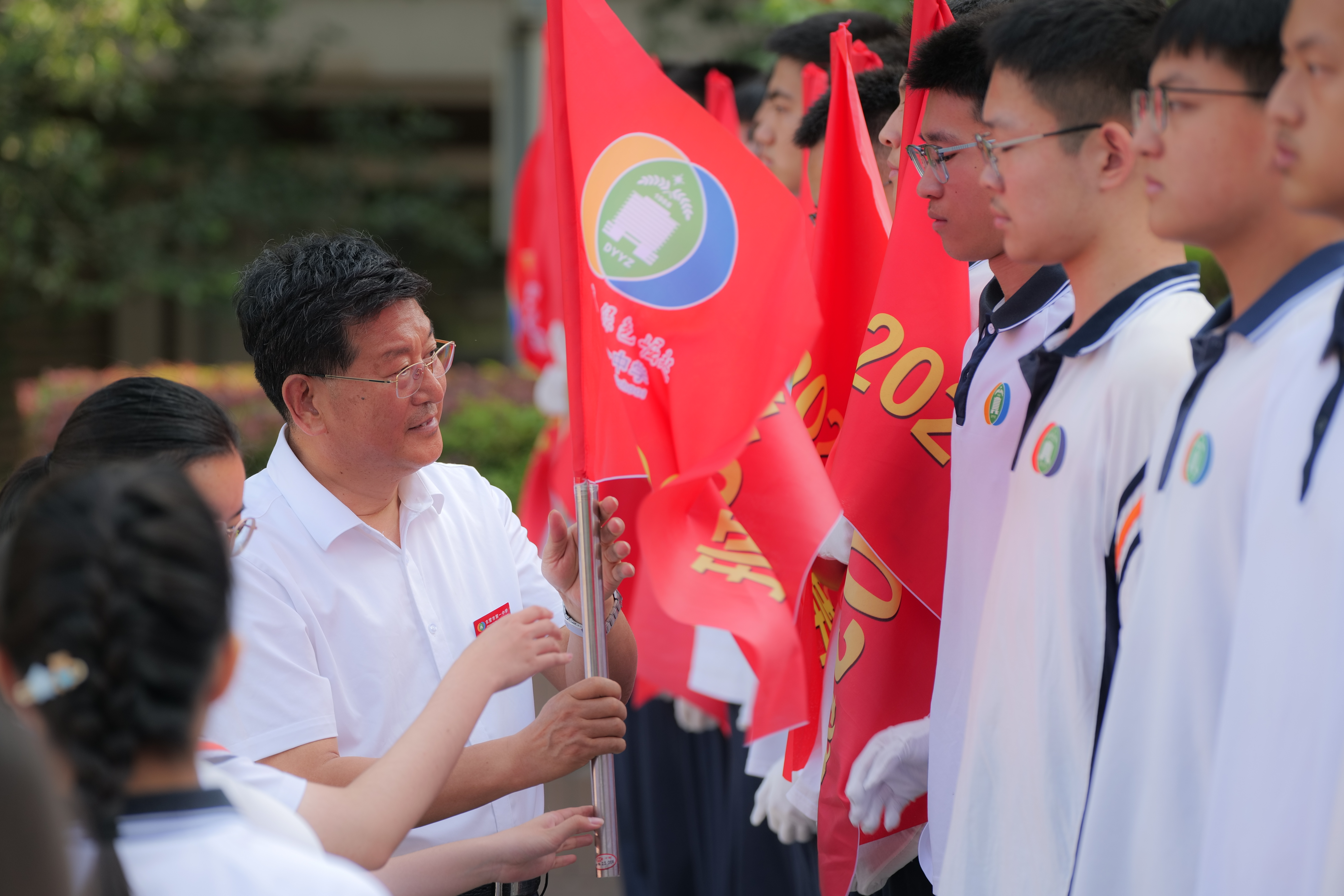 班旗是班集体的魂魄,凝聚着班级的初心使命,是砥砺前行的精神旗帜!在催人奋进的乐曲声中,学校党委书记、校长史本泉为各班授旗,各班旗手在统一口令中展示班旗。