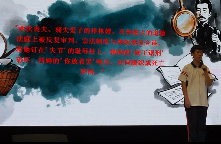 展演在《呐喊·彷徨》的戏剧演绎中拉开帷幕。李可馨团队以极具张力的表演再现鲁迅《风波》中的世态人情,七里屯的辫子风波在年轻演员的精准诠释下,折射出封建桎梏下的人性困局。随后,研读报告环节迸发思想火花:缪子璘同学以《落幕——鲁迅作品中的死亡》叩问生命价值,张雅馨通过《明天——鲁迅作品中的女性》剖析时代枷锁,杜润泽则借《沟壑之恋》解读《平凡的世界》中爱情与变革的深刻联结。当温瑞莹原创诗歌《又见晓霞》的朗诵声响起,孙少平的精神图腾穿越文字化作舞台上的星光;赵鹏哲团队创作的歌曲《笔锋里有光》更以青春旋律唱响鲁迅的锋芒,引得全场共鸣。