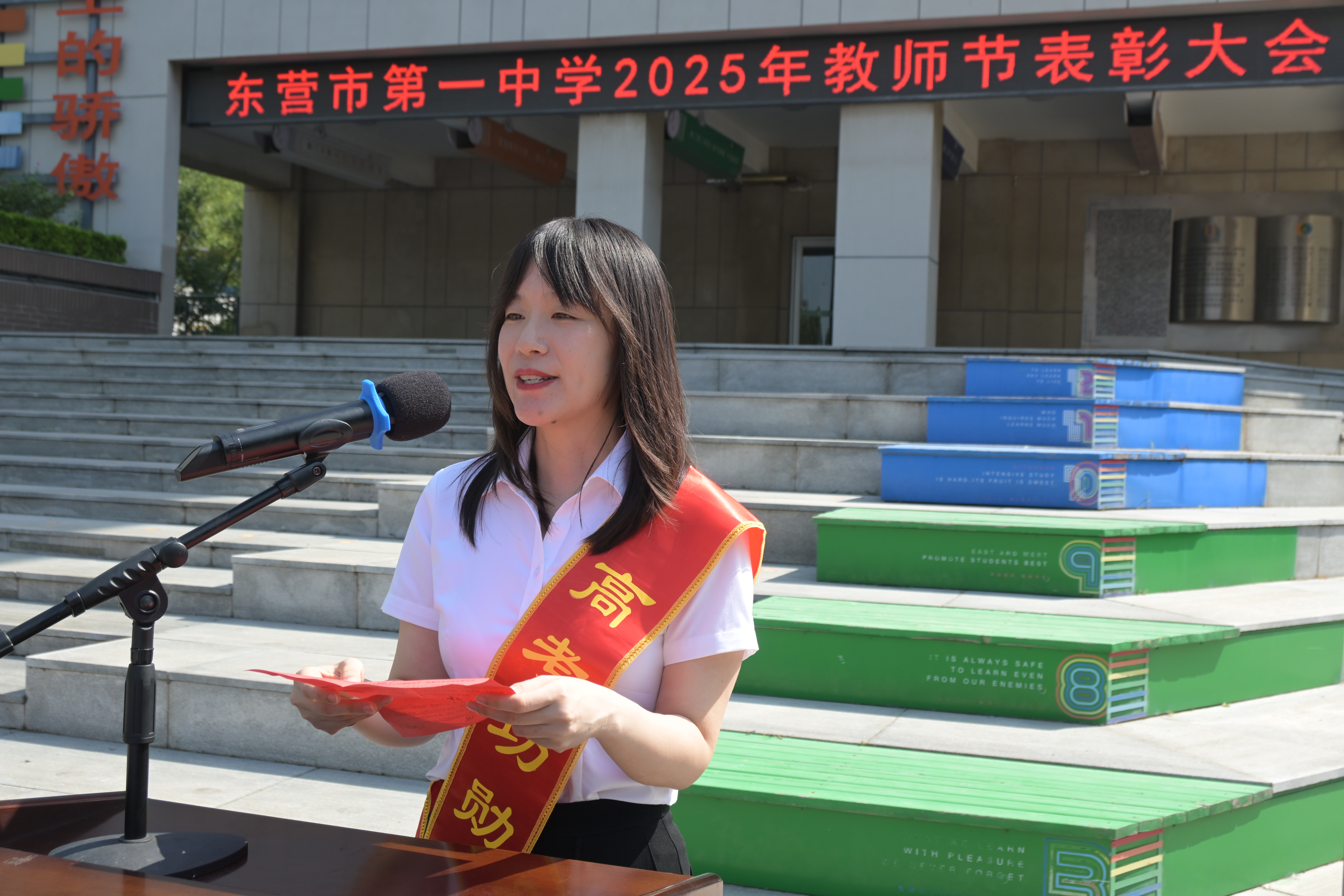 在金秋送爽、硕果盈枝的美好时节,东营市第一中学隆重举行优秀教师表彰活动,对过去一学年在各自岗位上表现卓越、贡献突出的教职工予以嘉奖。参加活动的有学校领导班子成员及我校部分优秀校友,他们共同为老师们庆祝节日。学校党委委员、副校长赖声平主持仪式。