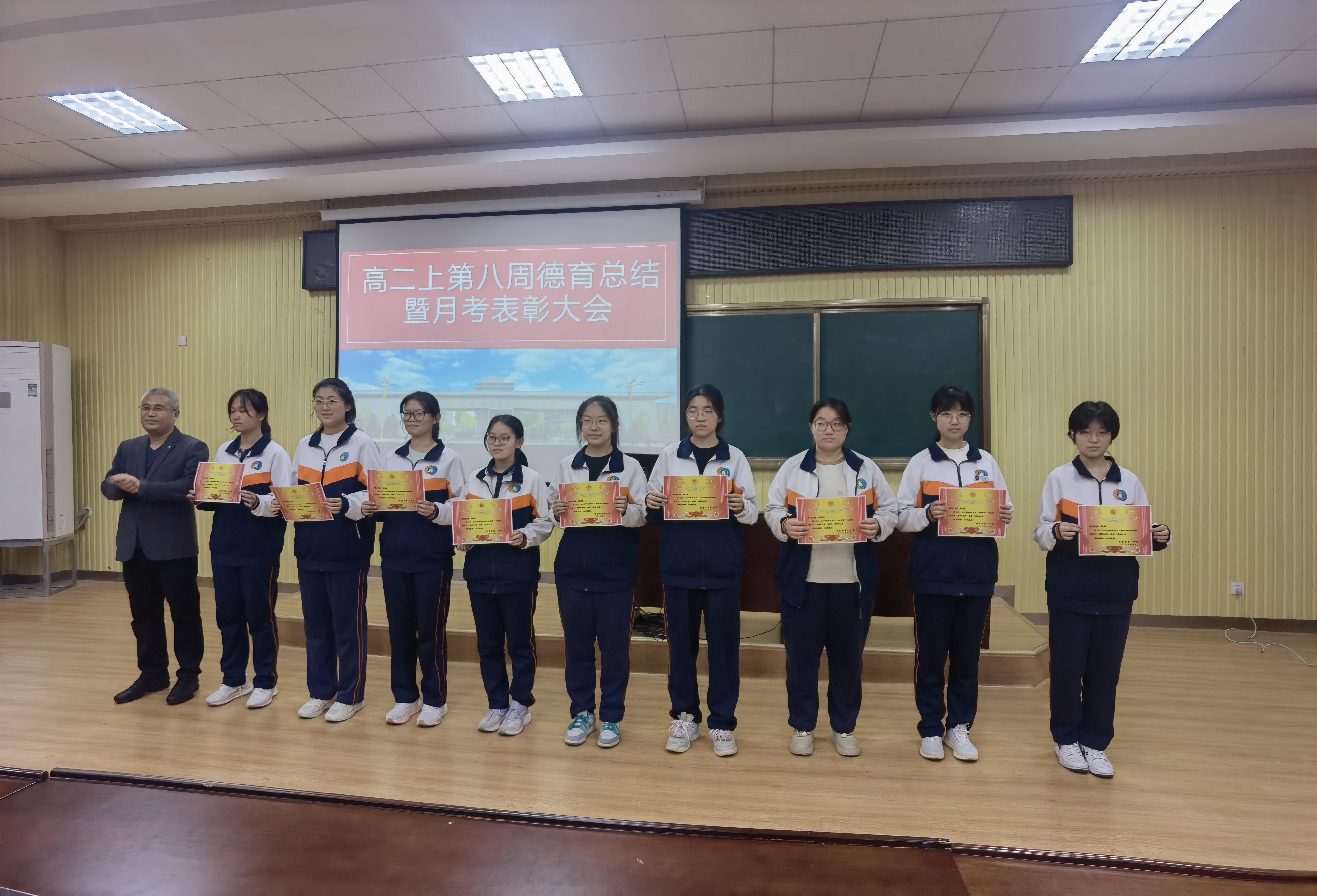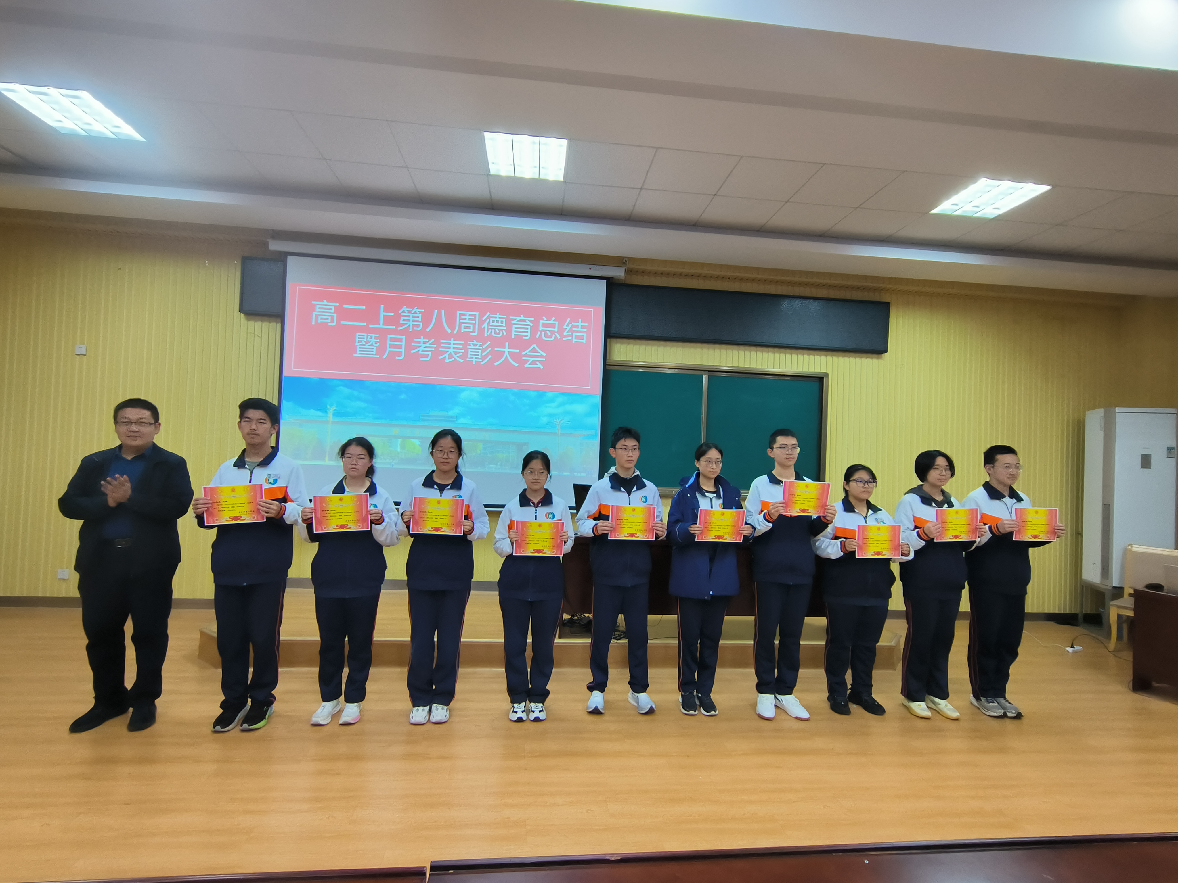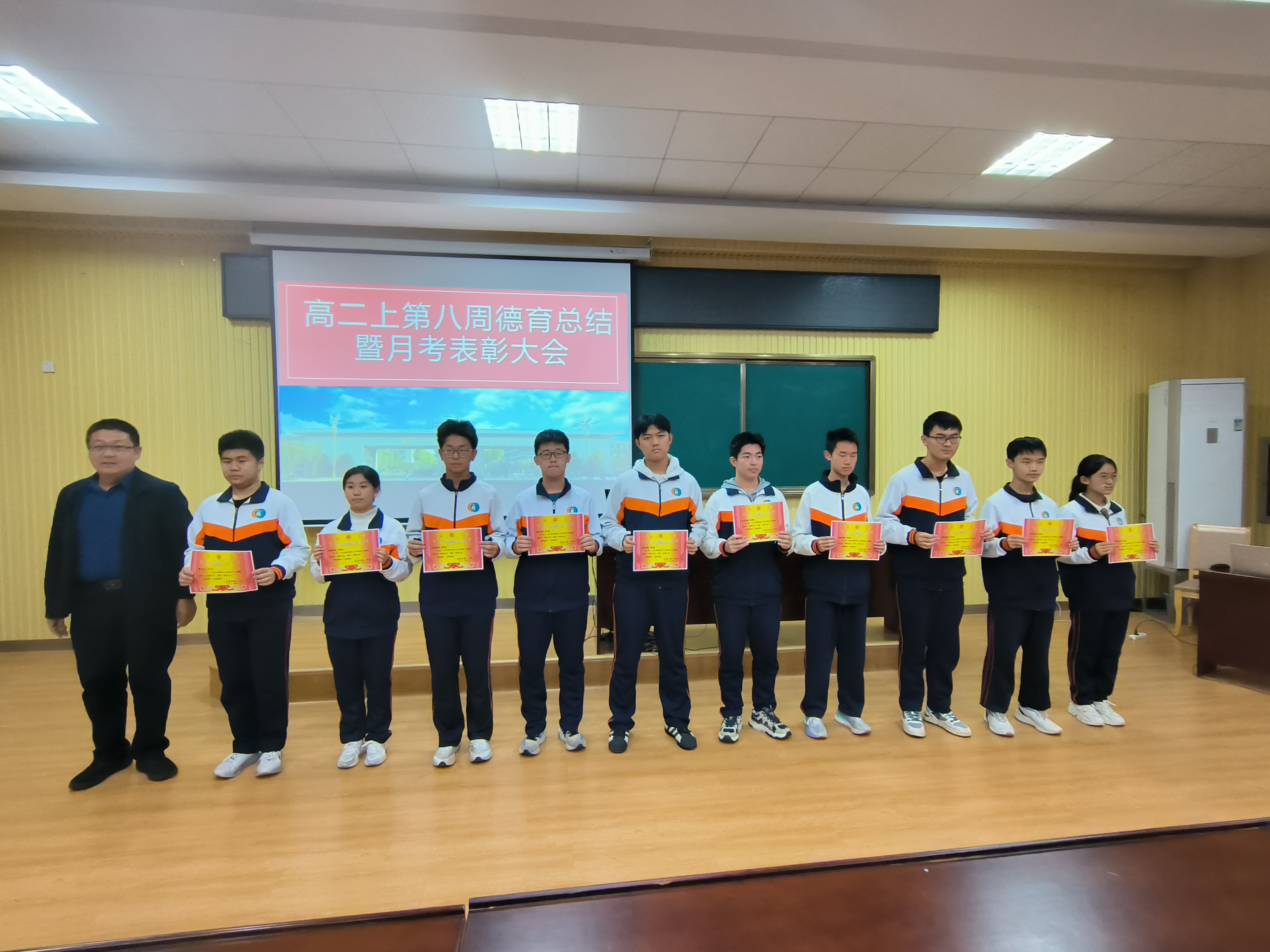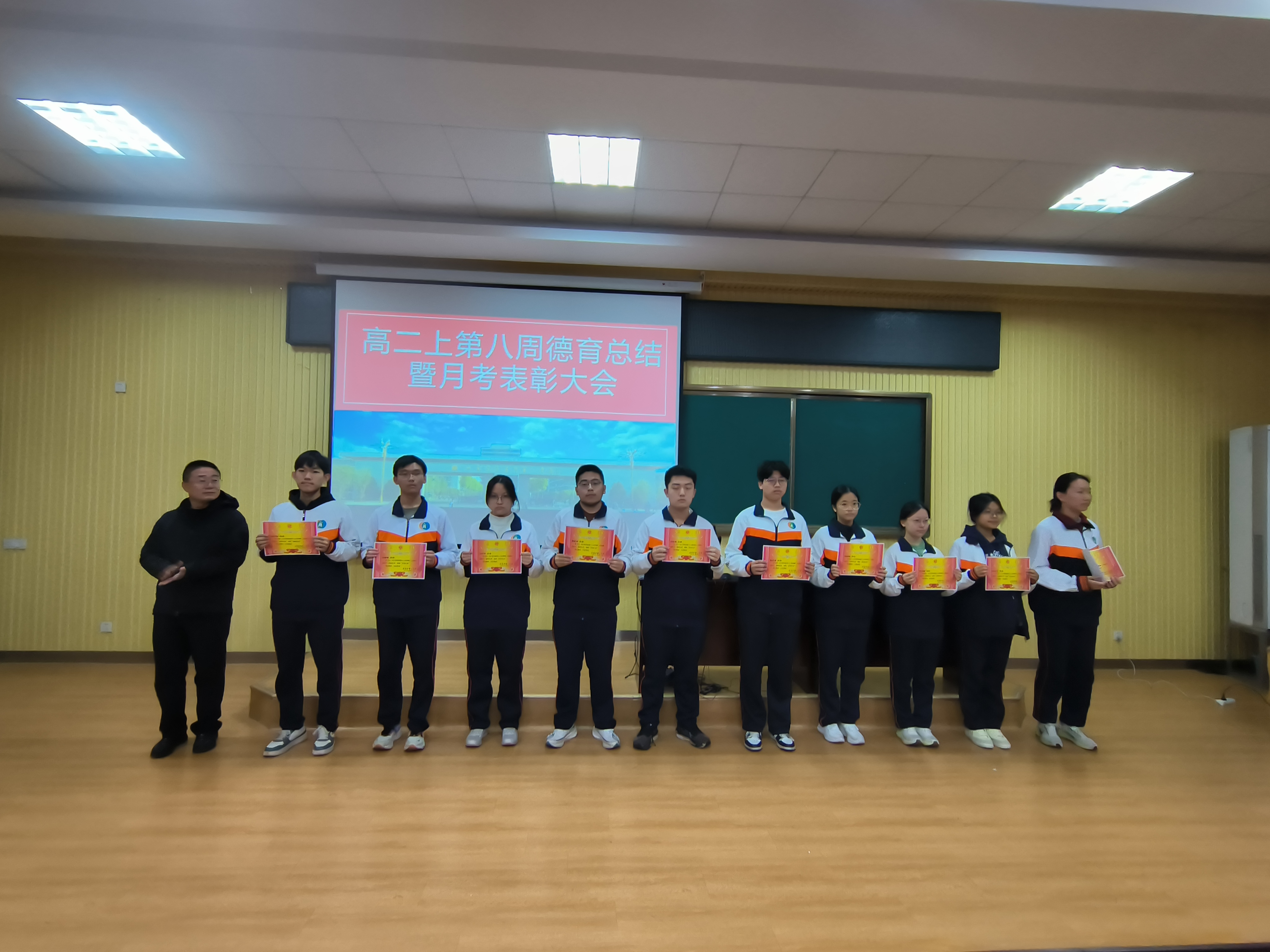 首先刘杰主任宣读了月考表彰决定,对在本次考试中表现突出的“优胜班级”与“卓越之星”予以通报表扬。在激昂的颁奖音乐中,孟磊、厉彦明、姬中敏等依次为获奖学生代表颁奖。一张张奖状,不仅是对他们勤奋付出的肯定,更是对全体同学的激励与召唤。.jpg)