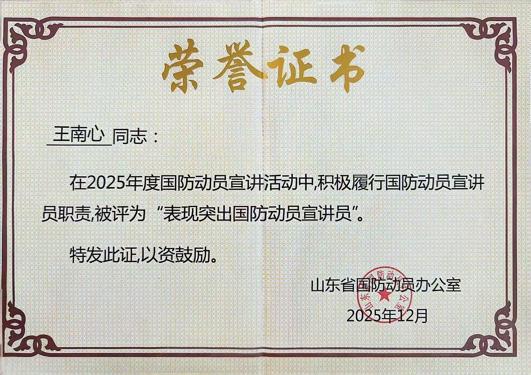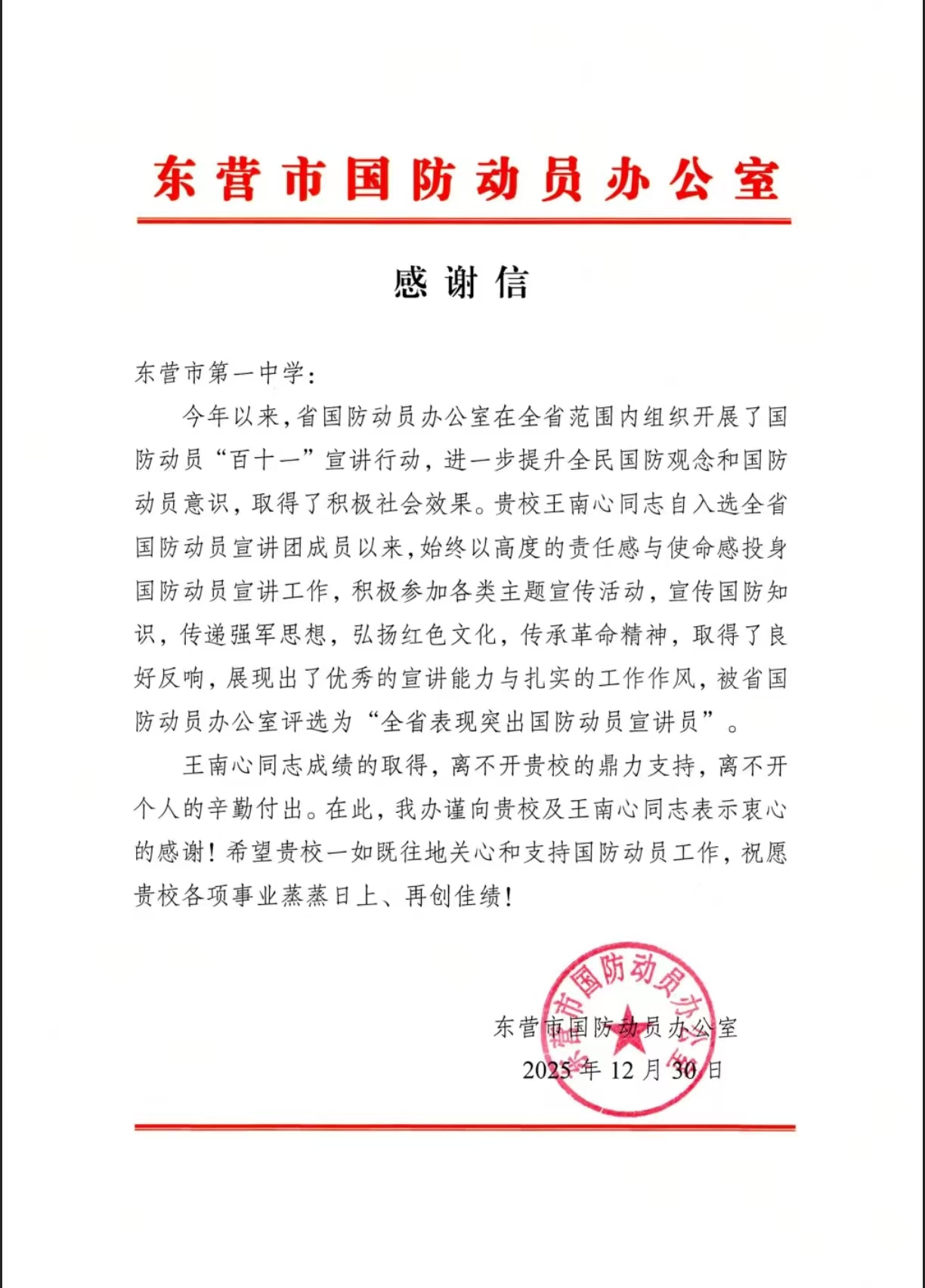 近日,东营市国防动员办公室向我校发来感谢信,对王南心老师在全省国防动员“百十一”宣讲行动中的突出表现予以高度肯定,并正式通报其获评“全省表现突出国防动员宣讲员”,同时感谢学校对国防动员工作的长期支持。