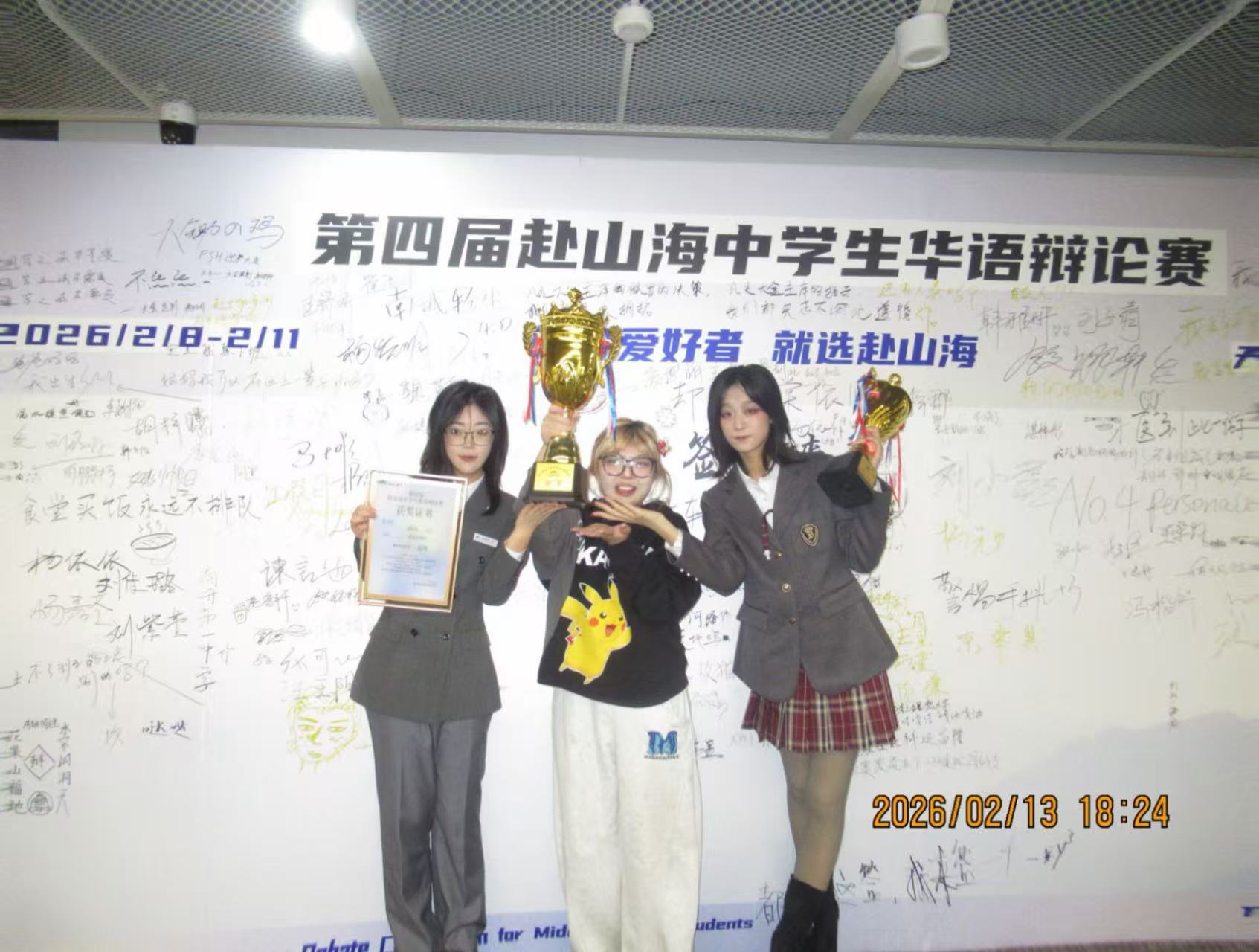 也非常感谢高一的队友们,愿意顶着学业的压力全力以赴备战比赛,每一次头脑风暴、每一轮模辩打磨,那些并肩奋战的日夜,都凝聚成了赛场上的默契配合。