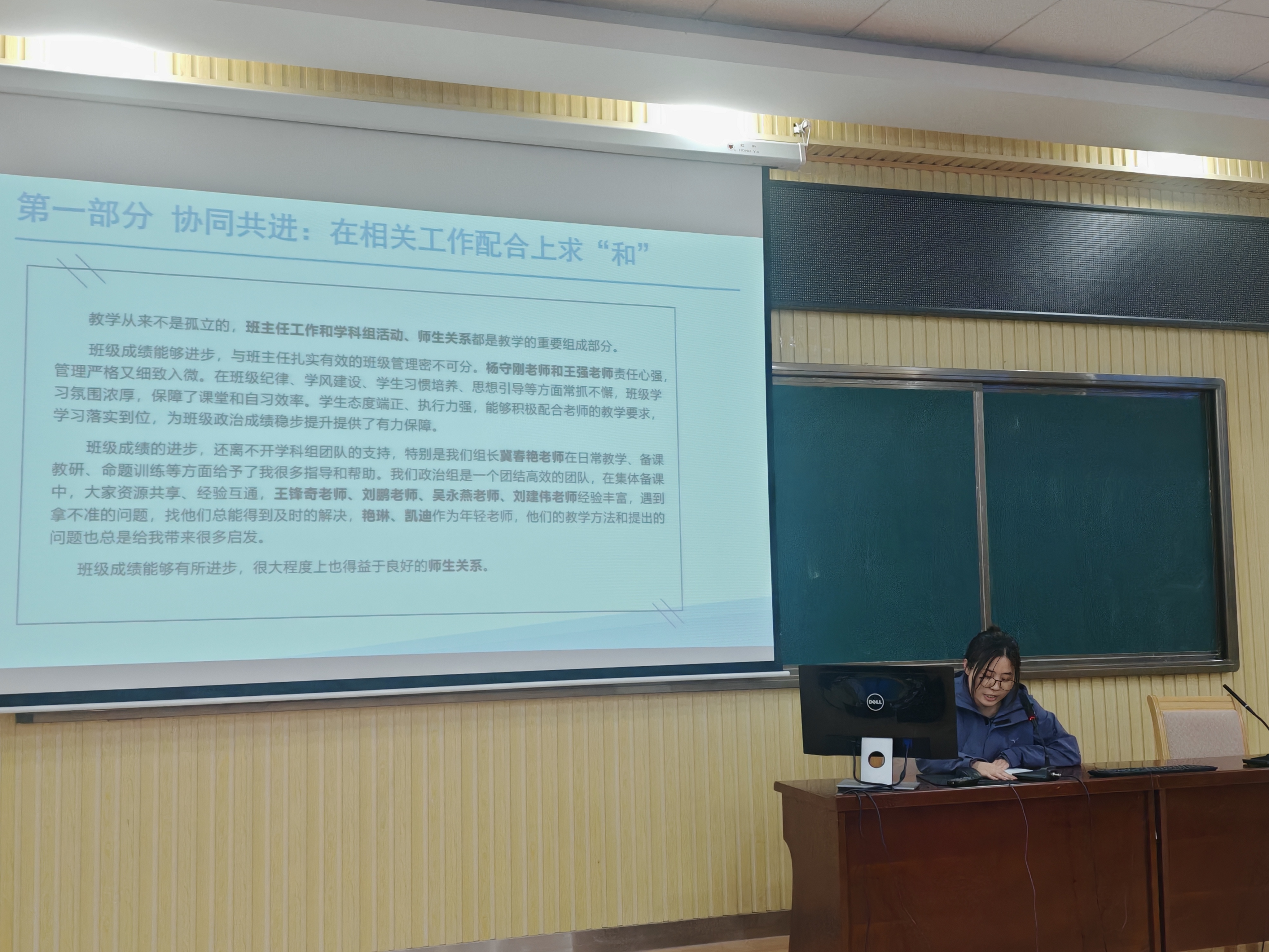 瞿老师从四个方面展开交流。一是协同共进求“和”。她指出,教学离不开班主任的严格管理和学科组的团队支持。任教班级的班主任老师营造了浓厚学风,政治组组内教师在备课教研中提供大量帮助,这是成绩提升的重要保障。二是抓实日常教学。备课以教材为本,集体与个人备课相结合;课堂注重思维培养,提升学生参与度;作业抓好检查与规范,狠抓背诵落实。三是尖子生培养。通过规范苛求,思想引导和树立班级标杆,带动整体学习氛围。四是边缘生转化。瞿老师认为学生渴望得到老师认可的程度远远超乎老师的想象。她在教学中始终坚持“多关注、多鼓励、多帮助”,课堂倾斜、作业详批,适当降低难度,构筑学科信心,激发学习动力。瞿老师最后总结道,教育是一场温暖的修行,教学是一场持续的攀登,唯有扎扎实实落实常规,才能稳步前行。