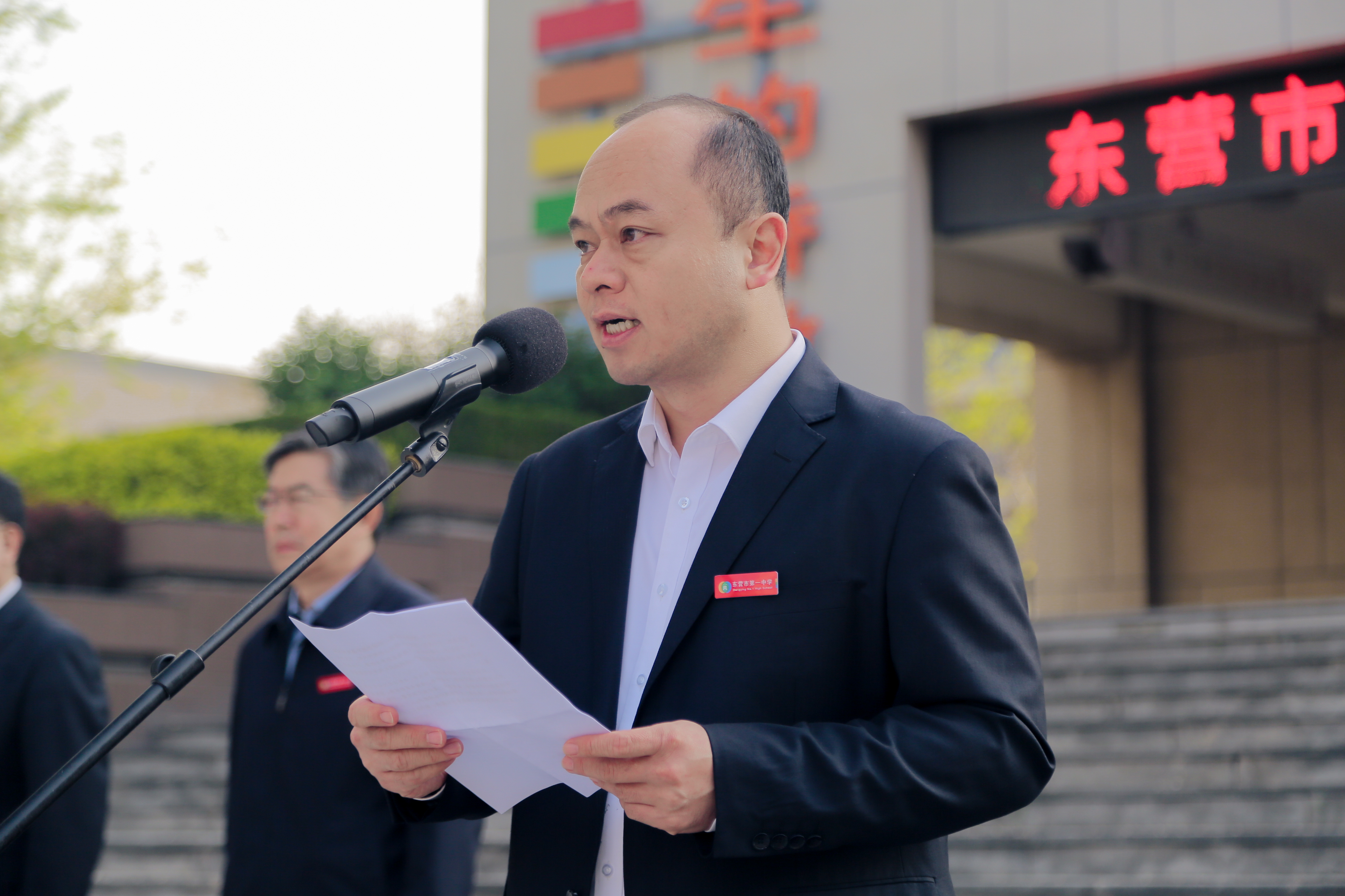 动员大会上,学校党委书记、校长史本泉向高一级部主任韩磊授出征旗。
