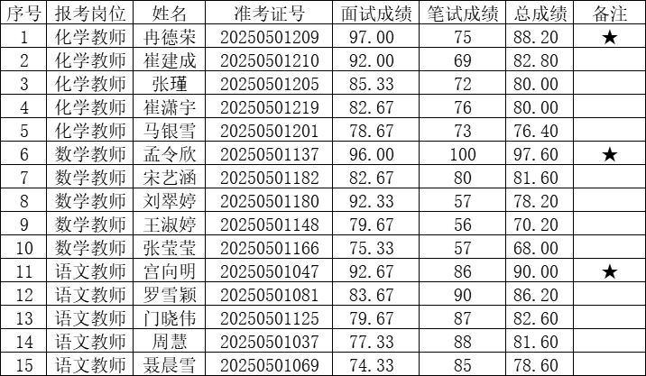 注:备注栏加★者为进入体检考察范围人选,体检注意事项请关注东营市第一中学网站相关信息。