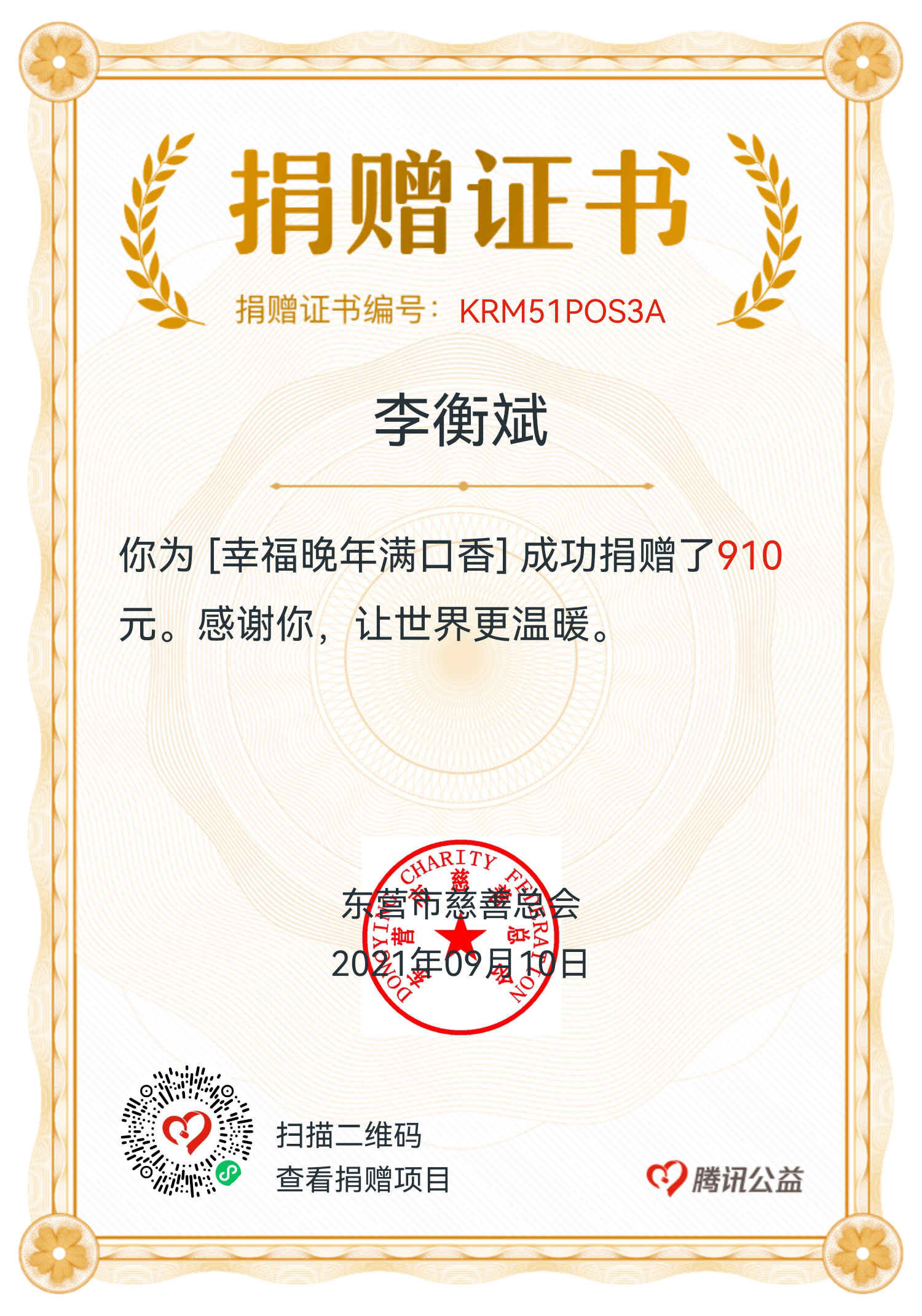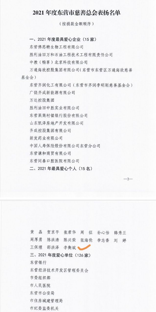 主持人李衡斌老师荣获2021年度东营市慈善总会——最具爱心个人称号