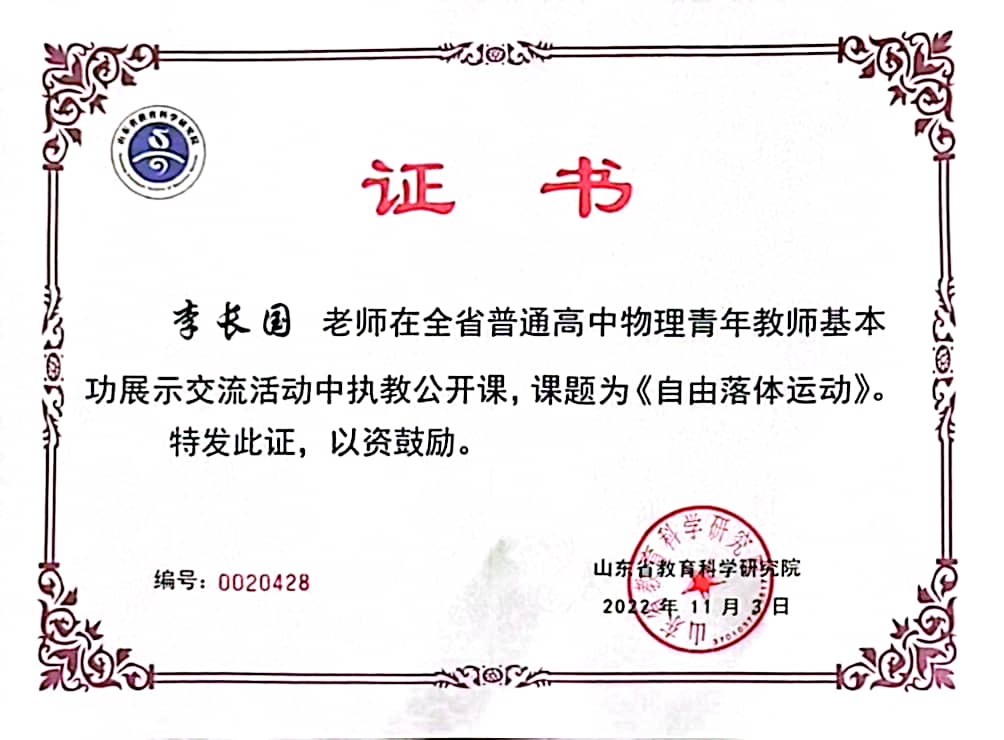 李长国老师在全省普通高中物理青年教师基本功展示交流活动中执教公开课,课题为《自由落体运动》。获得专家一致好评。