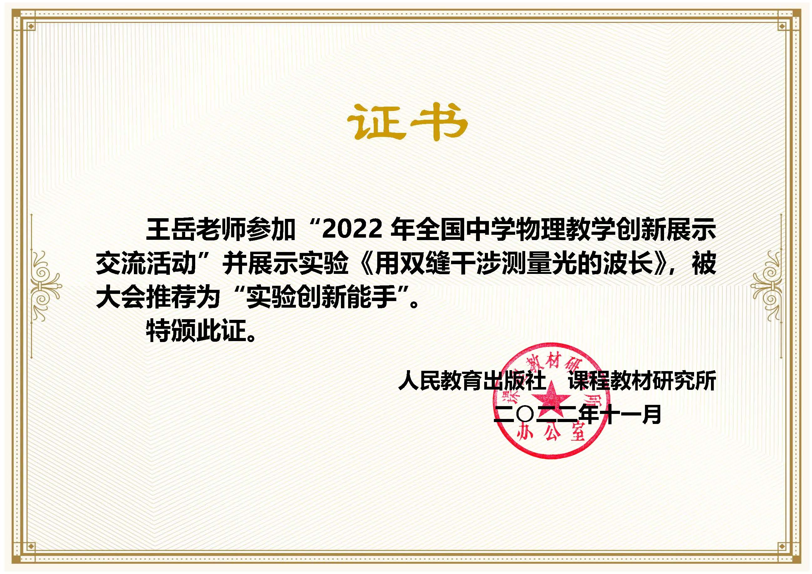 我校王岳老师代表山东省参加此次比赛,与来自全国各省(自治区、直辖市)的优秀物理教师同台竞技,并从中脱颖而出被评为“实验创新能手”。