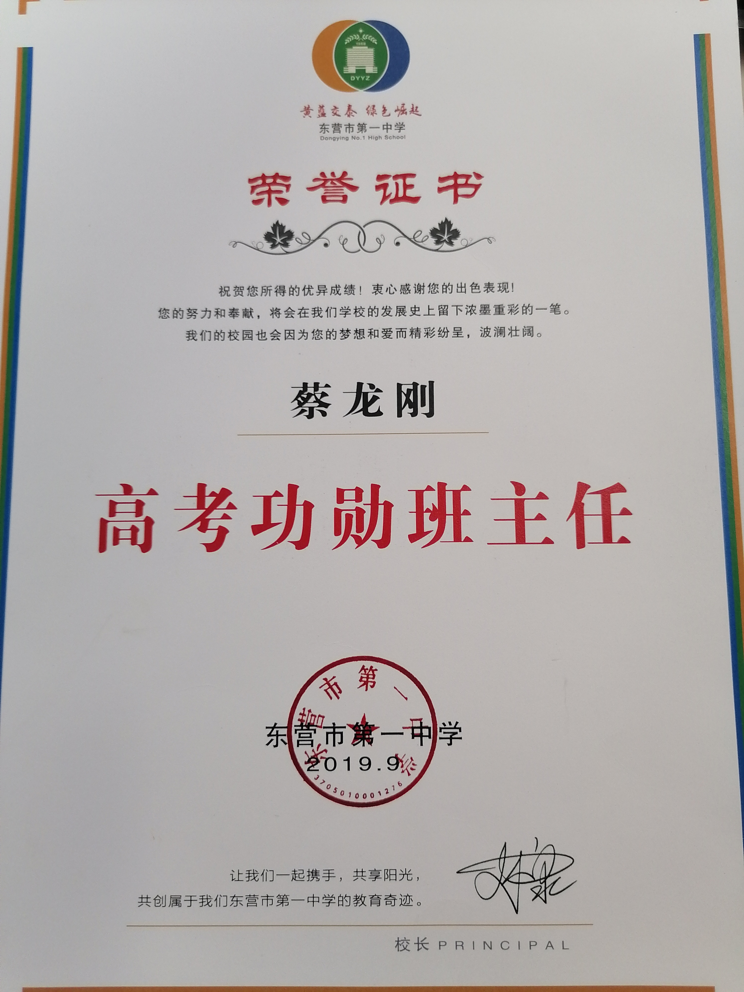 蔡龙刚老师被评为2019年高考功勋班主任