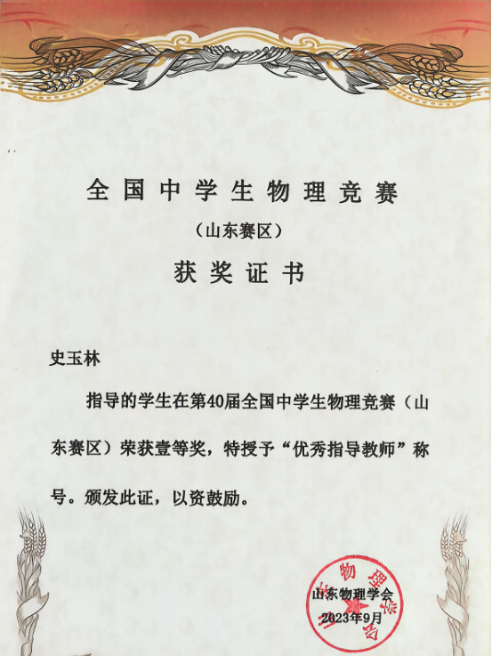 史玉林荣获第40届全国中学生物理竞赛(山东赛区)优秀指导教师