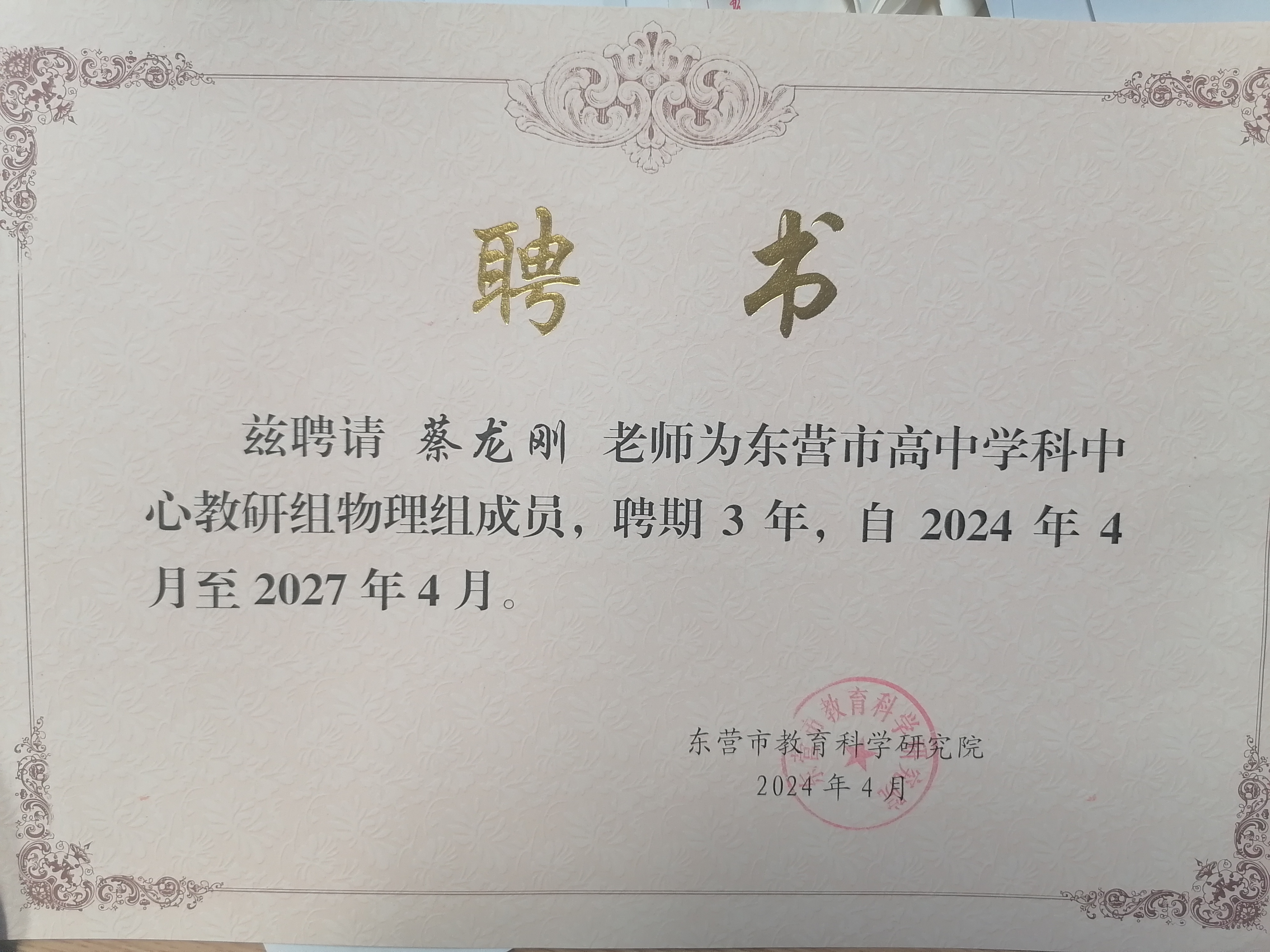 蔡龙刚老师被聘为东营市高中学科中心教研组成员