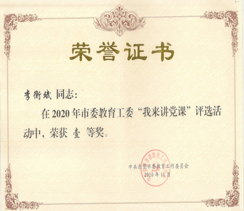 近年来,李衡斌所在的党支部被评为东营市教育系统先进党组织,有4人获得市级优秀共产党员荣誉称号,有2名党员教师获评正高级教师职称,150人次获校级及以上先进称号。而他也连续8年被评为“最让群众满意党员”,2019年,在学校支部书记述职评议中夺得第一名,2020年在中共东营市委教育工委举办的“我来讲党课”活动中荣获一等奖。2021年第三党支部被中共东营市委评为“优秀基层党支部”。