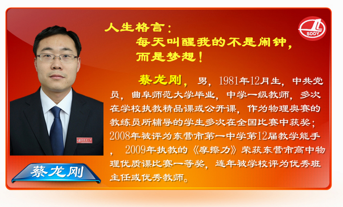 2004年曲阜师范大学毕业至今,蔡老师一直在东营市第一中学从事教育工作,传道授业,孜孜不倦。作为物理教师,他精心备课,钻研教学方法,耐心辅导答疑,课间甚至午饭后的休息时间也在指导学生,所带班级物理成绩始终名列前茅,2009年获东营市高中物理优质课一等奖。