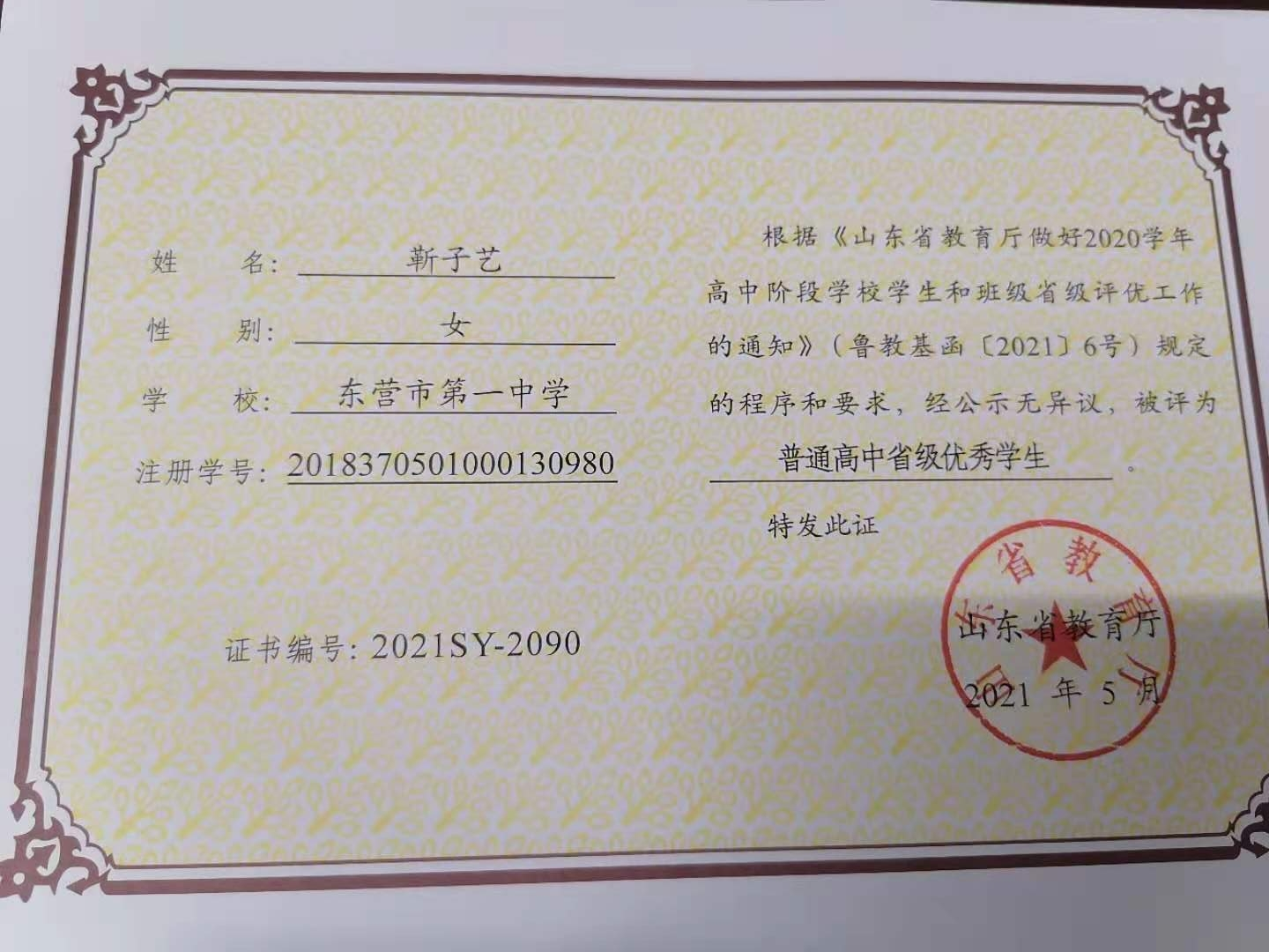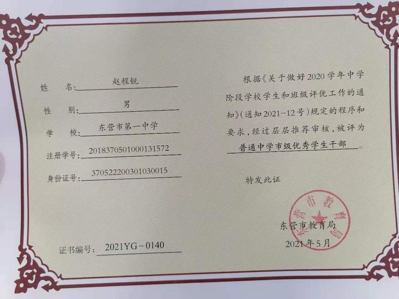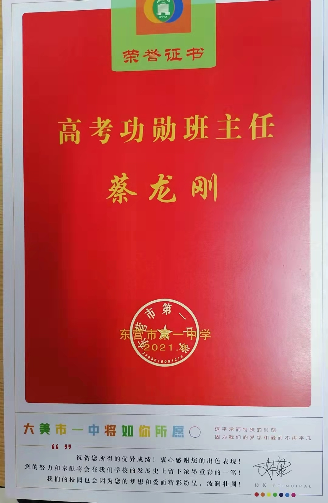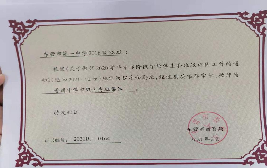 2021年高考之前,喜报传来,蔡老师带领的28班获得东营市优秀班集体荣誉称号,靳子艺同学被评为省级优秀学生,赵程锐同学被评为市级优秀学生干部。