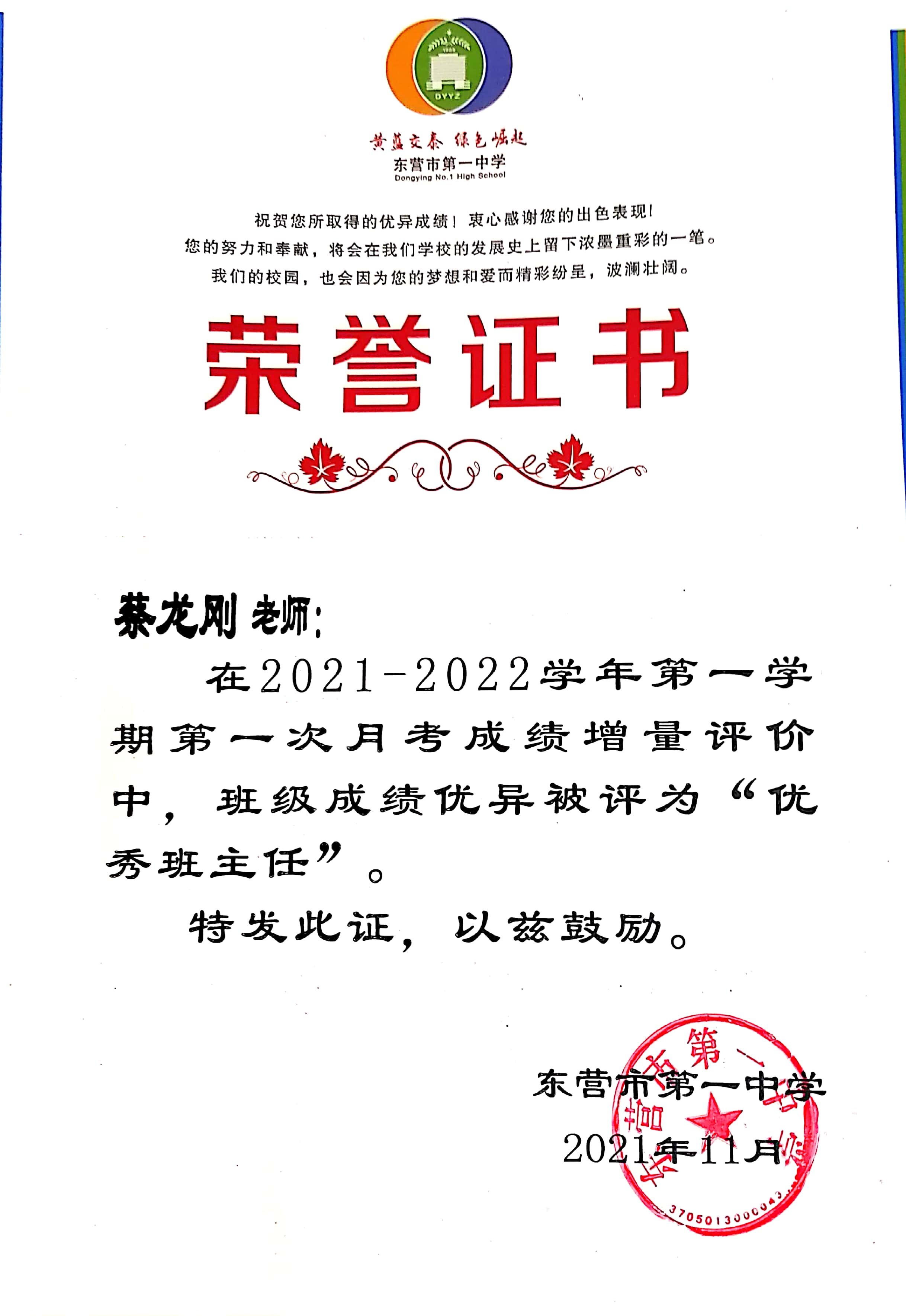 2021年高考之后,蔡老师再次接到新高三级部的邀请,加入2019级部,5年来第4届高三学生。2021年11月,高三15班在月考中进步明显,被评为增量评价先进班级,蔡老师再次被评为“优秀班主任”。