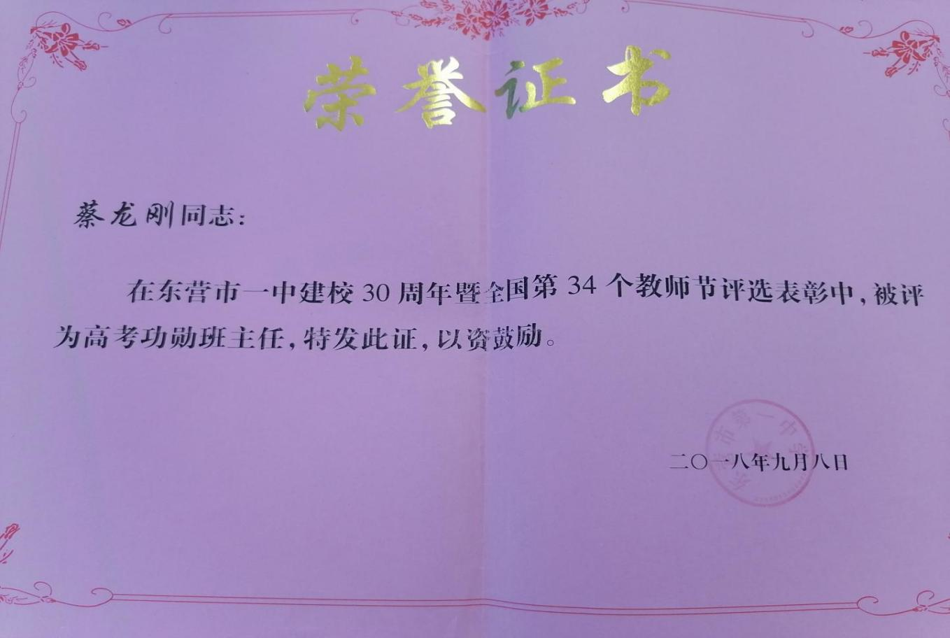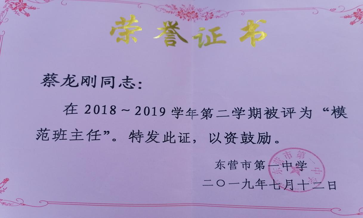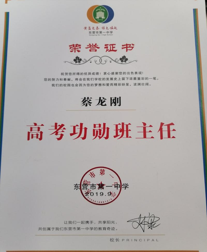 蔡老师担任班主任的15级32班和16级21班在2018年和2019年高考中均取得同层次班级第一名的好成绩,蔡老师也连续第二年被评为高考功勋班主任!