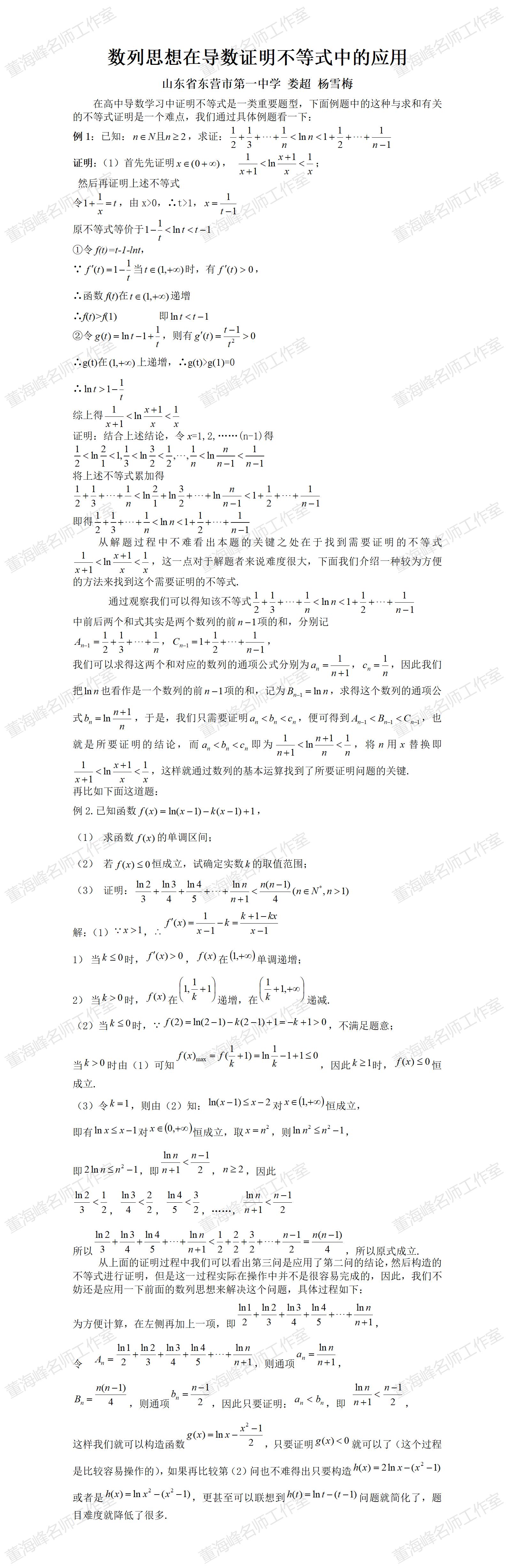 数列思想在导数证明不等式中的应用 山东省东营市第一中学 娄超 杨雪梅