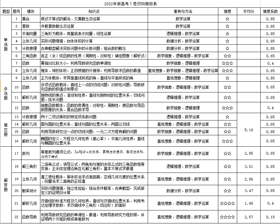 从模块角度,2022年函数导数4小1大32分,解析几何3小1大27分,立体几何3小1大27分,三角函数与解三角形1小1大17分,概率统计1大12分,数列1大10分,计数原理2小10分,集合1小5分,复数1小5分,平面向量1小5分。