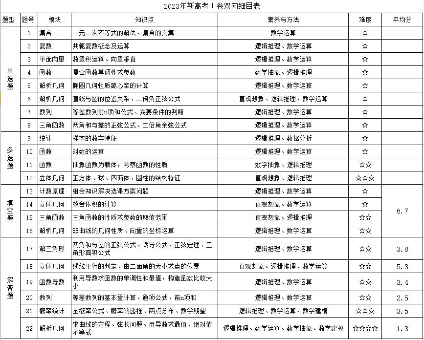 2023年函数导数3小1大27分,解析几何3小1大27分,立体几何2小1大22分,三角函数与解三角形2小1大20分,概率统计1小1大17分,数列1小1大17分,计数原理1小5分,集合1小5分,复数1小5分,平面向量1小5分。可以看出2023年在突出函数、解析几何、立体几何的同时,对概率与统计、数列等做了加强,计数原理、集合、复数、平面向量等每年必考,且都是容易题。
