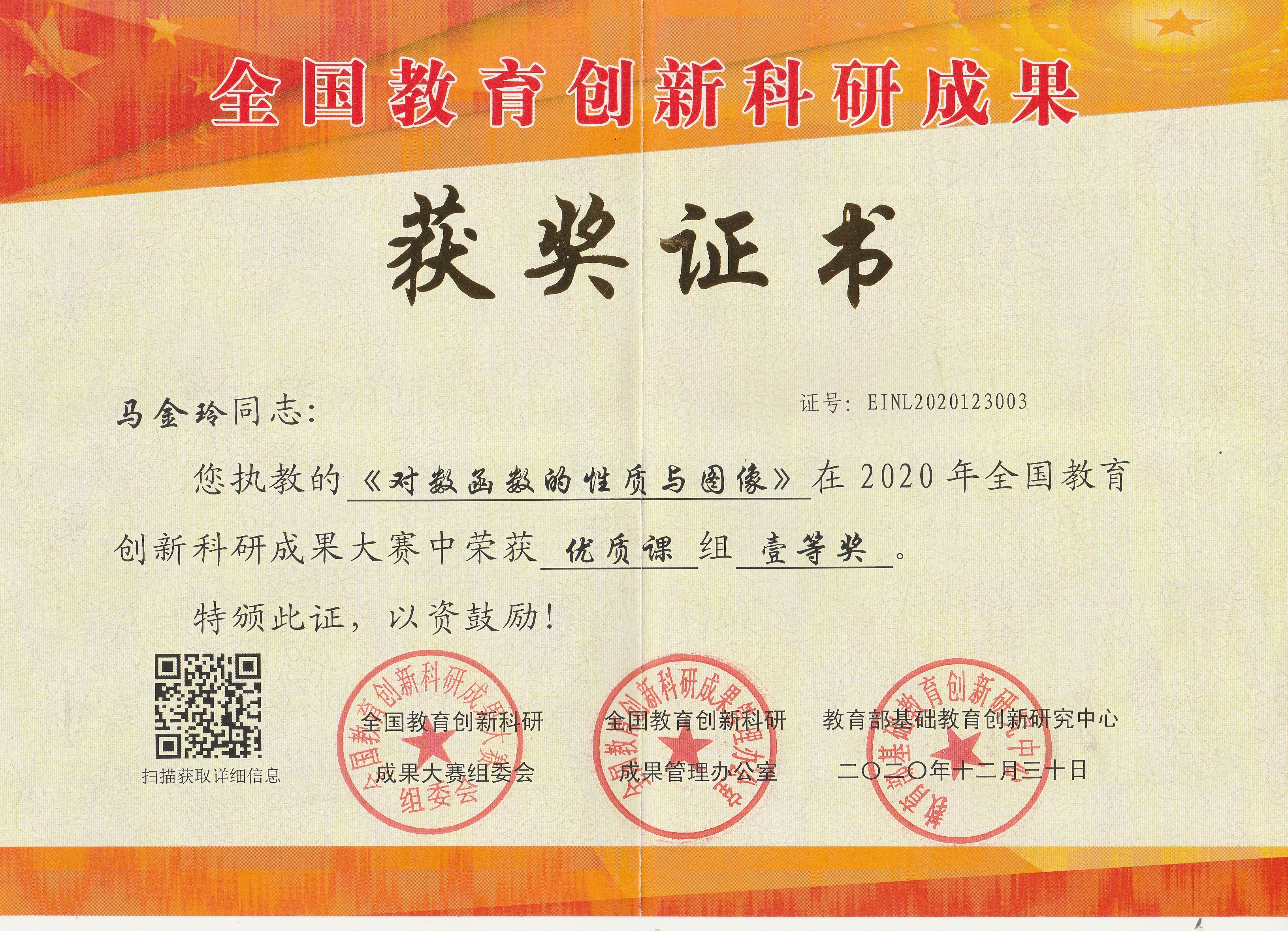 马金玲在2020年全国创新科研成果大赛中获优质课一等奖