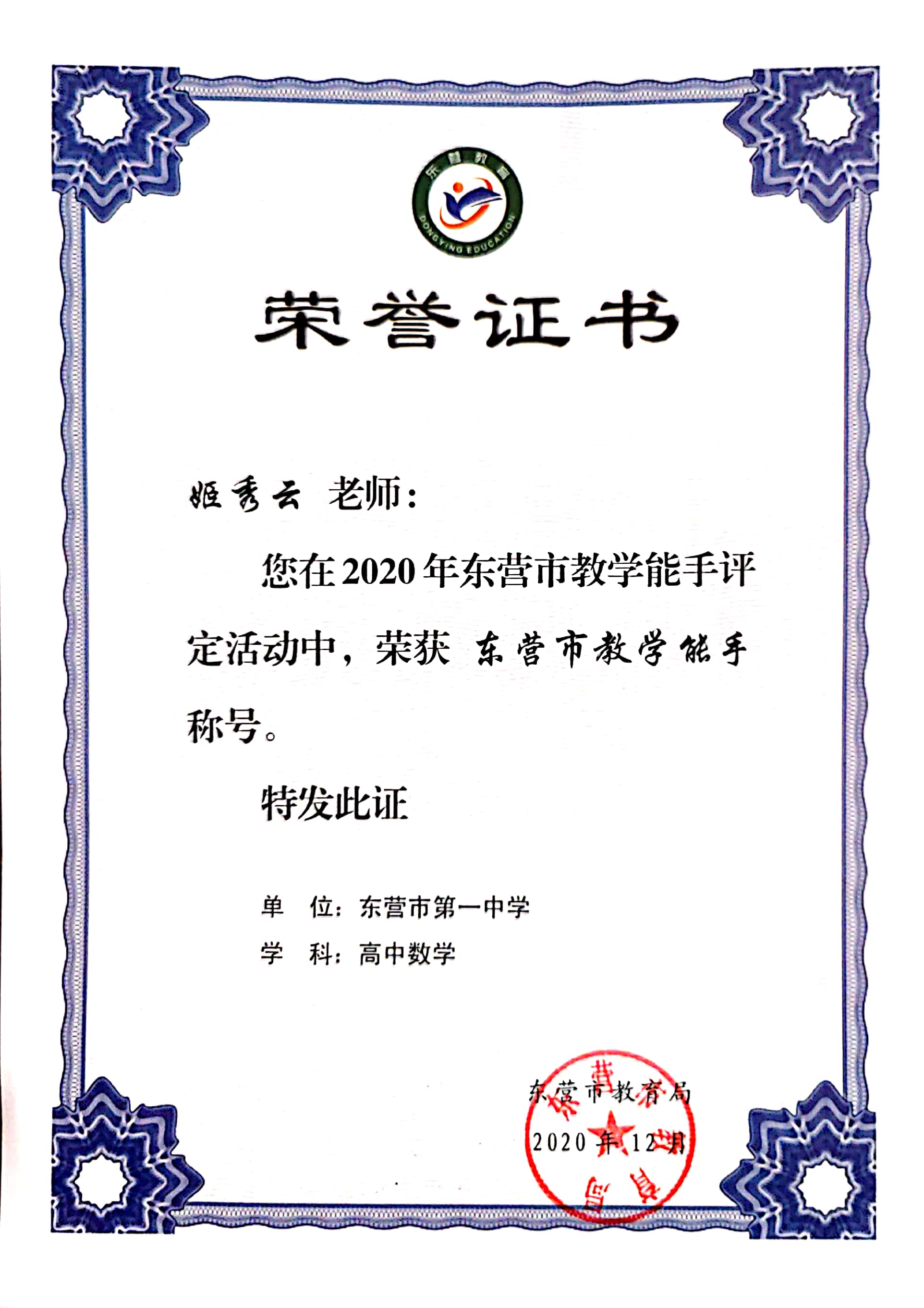 姬秀云在2020年东营市教学能手评选中获东营市教学能手
