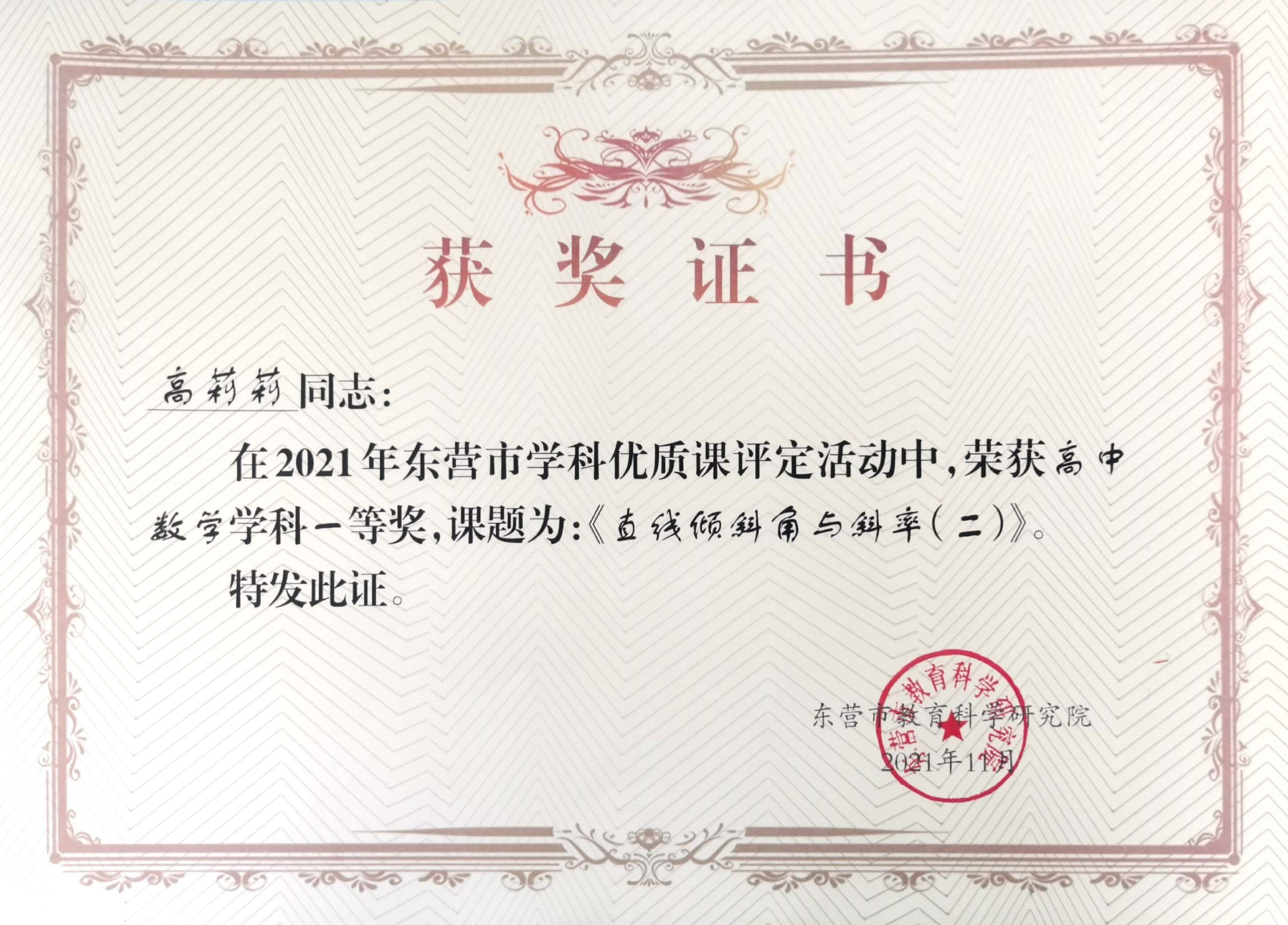 高莉莉在2021年东营市学科优质课评定活动中荣获高中数学学科一等奖