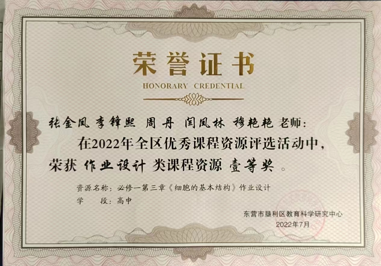 李锋熙在2022年垦利区优秀课程资源评选活动中荣获作业设计类课程资源一等奖。