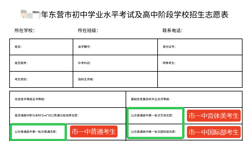1.学生填报志愿时,在志愿表中填报东营市一中国际部或者艺体志愿。