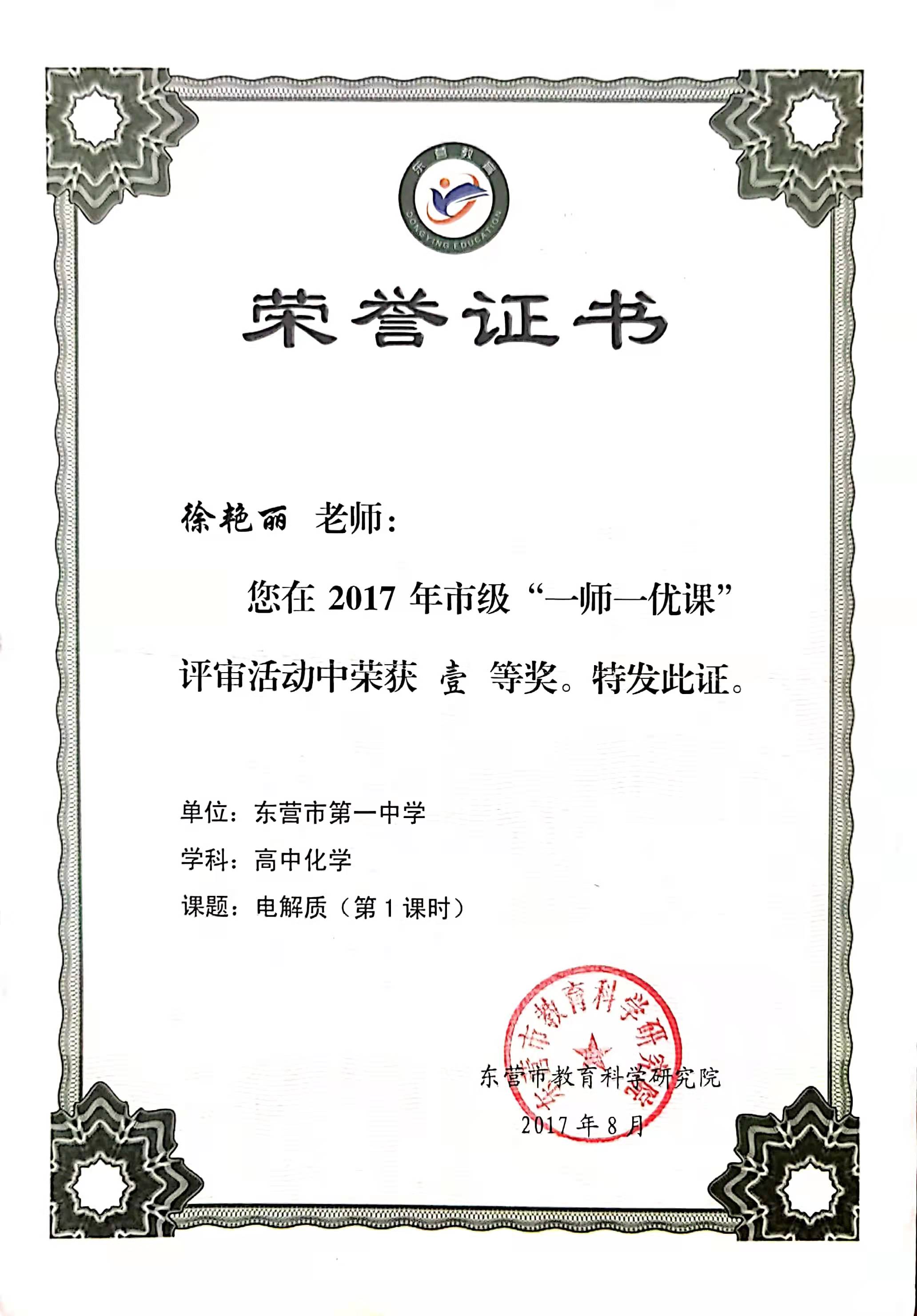 徐艳丽获市“一师一优课”一等奖