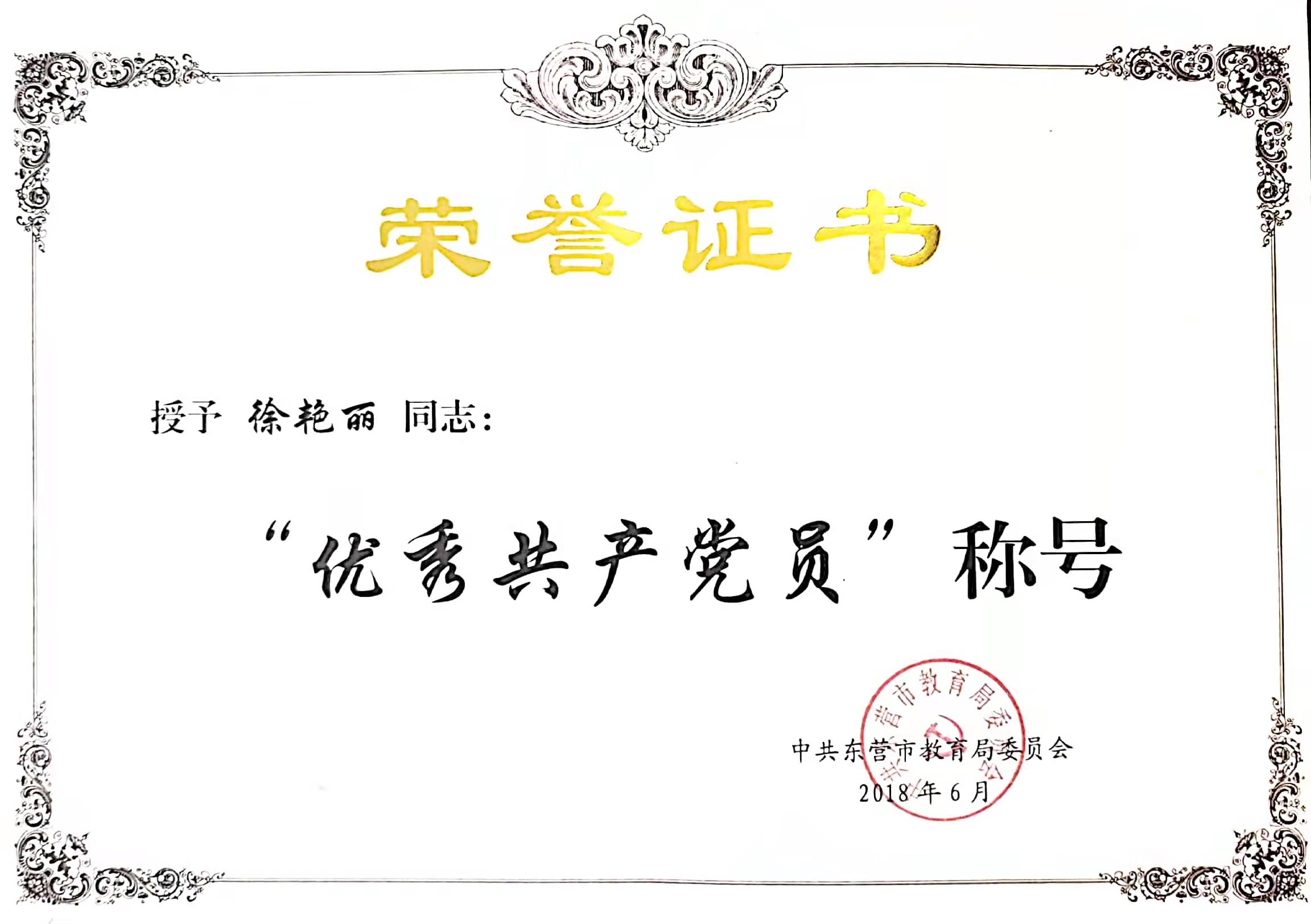 徐艳丽获东营市优秀共产党员称号