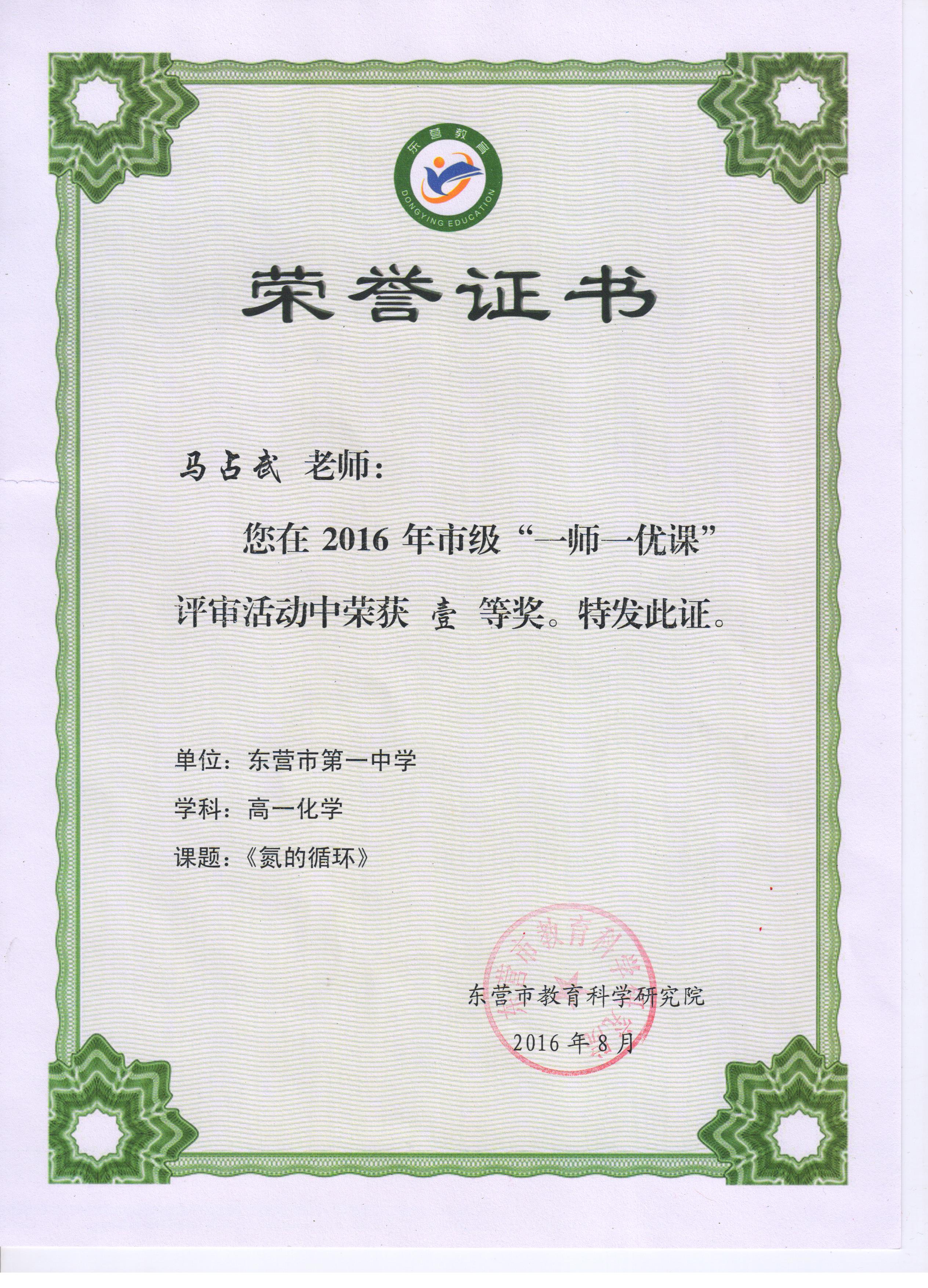 在2016年东营市“一师一优课”评审活动中,马占武老师的《氮的循环》获市级优课评比一等奖。