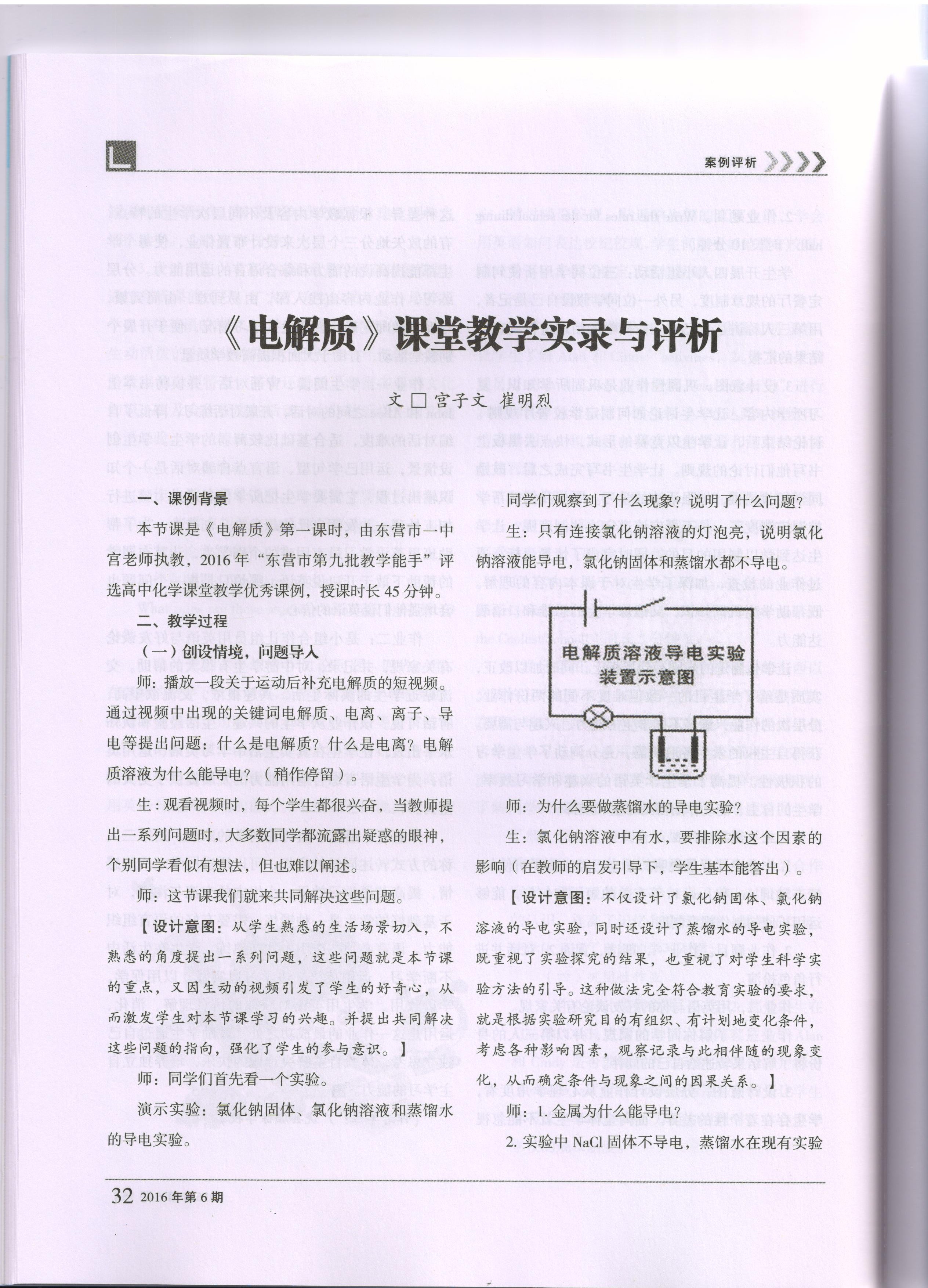 在第十一届教学能手评选中,宫子文老师执教的《电解质》获得评委一致好评。授课完成后,在教科院崔明烈老师的指导下,将授课内容整理成课堂实录,并发表在2016年第六期《东营教育》。