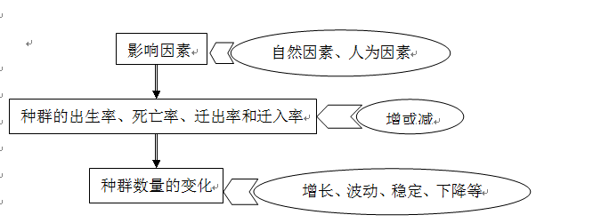 6、影响种群变化的因素 同学们想一想,哪些因素会使种群数量增长、稳定、波动和下降呢?学生分析回答,教师总结如下: