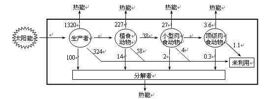 分析图可知:每一个营养级同化的能量有四个去路:通过呼吸作用以热能的形式散失、流向下一营养级、流向分解者,还有一部分属于未利用的能量。能量的去路之和为该营养级同化的能量。所以植食动物同化的能量为227+38+58+14=337,生产者同化的能量为1320+337+324+100=2081,小型肉食动物同化的能量为38,顶级肉食动物的同化量为3.6+1.1+0.3=5,然后可以计算出每两个相邻营养级之间的能量传递效率。