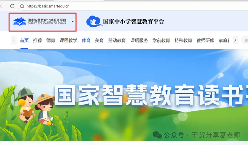 1、打开国家中小学智慧教育平台:https://basic.smartedu.cn,点击左上角的国家智慧教育公共服务平台。