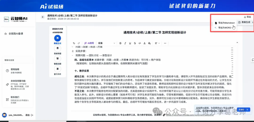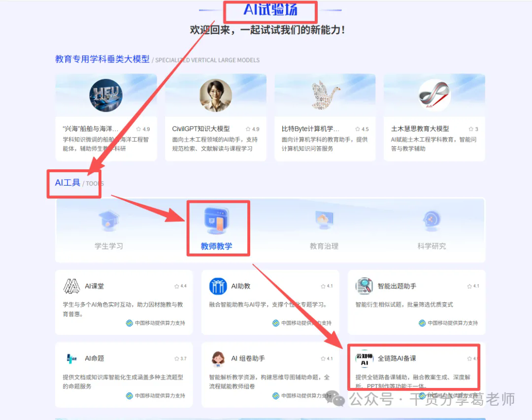 3、进入AI试验场下方找到AI工具里的教师教学选项中的云知识AI-全链路AI备课。