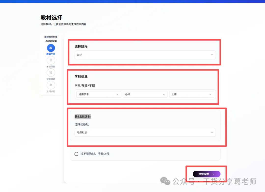 5、进入教材选择界面—设置您的教学参数比如学段、学科年级信息、教材出版社等,个性化您的教案。然后点击继续探索,跳转到教学设置界面。
