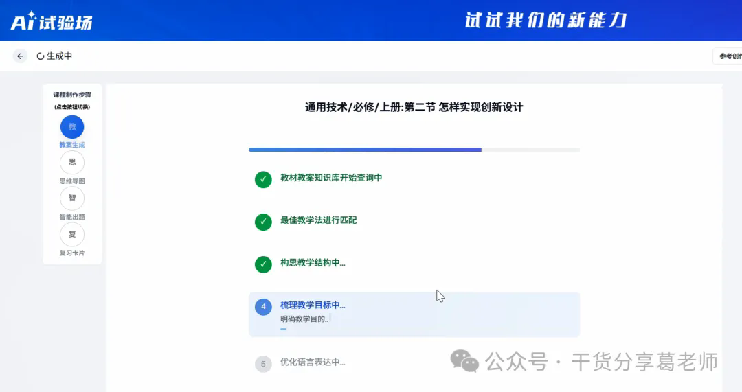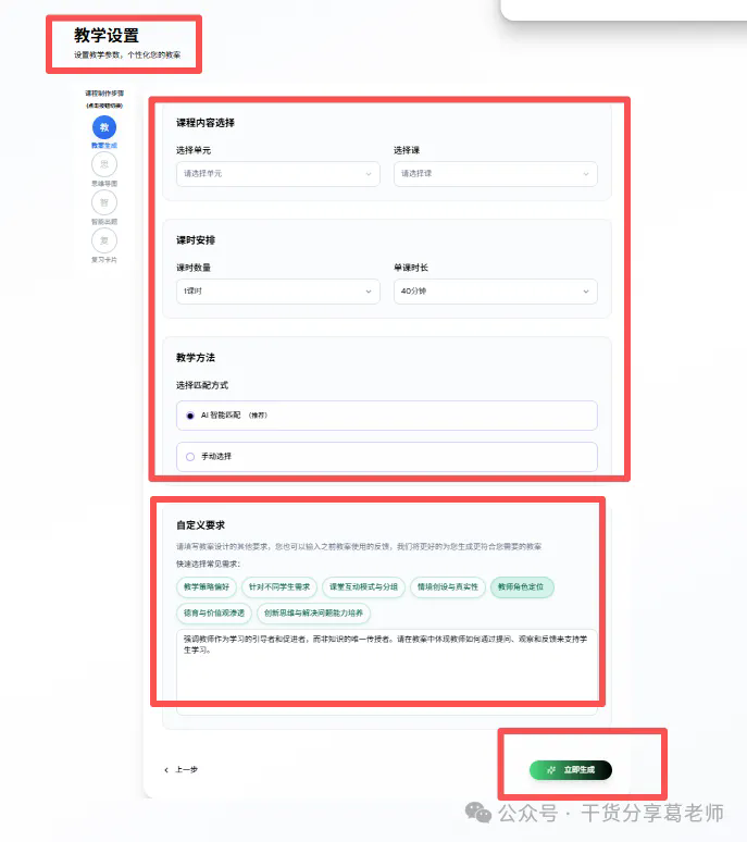 6、在教学设置界面我们可以更详细的设置课程内容选择安排,比如选择单元、选择具体的某一课、课时安排单课时长、教学方法以及自定义要求等。最后没问题点击立即生成。