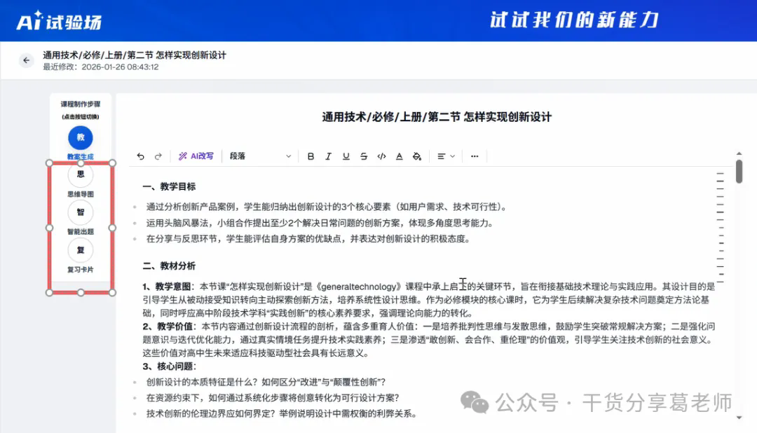 你还在为备课熬深夜?翻遍资源库凑教案、绞尽脑汁设计教学环节、耗时半天出习题的日子,终于可以翻篇了!当云知识AI遇上全链路备课,从教案生成、知识导图绘制,到智能出题、复习卡片制作,备课全流程一键打通,80%的备课工作高效搞定,让你从繁琐案头工作中抽离,把更多精力留给教学设计与课堂灵感!