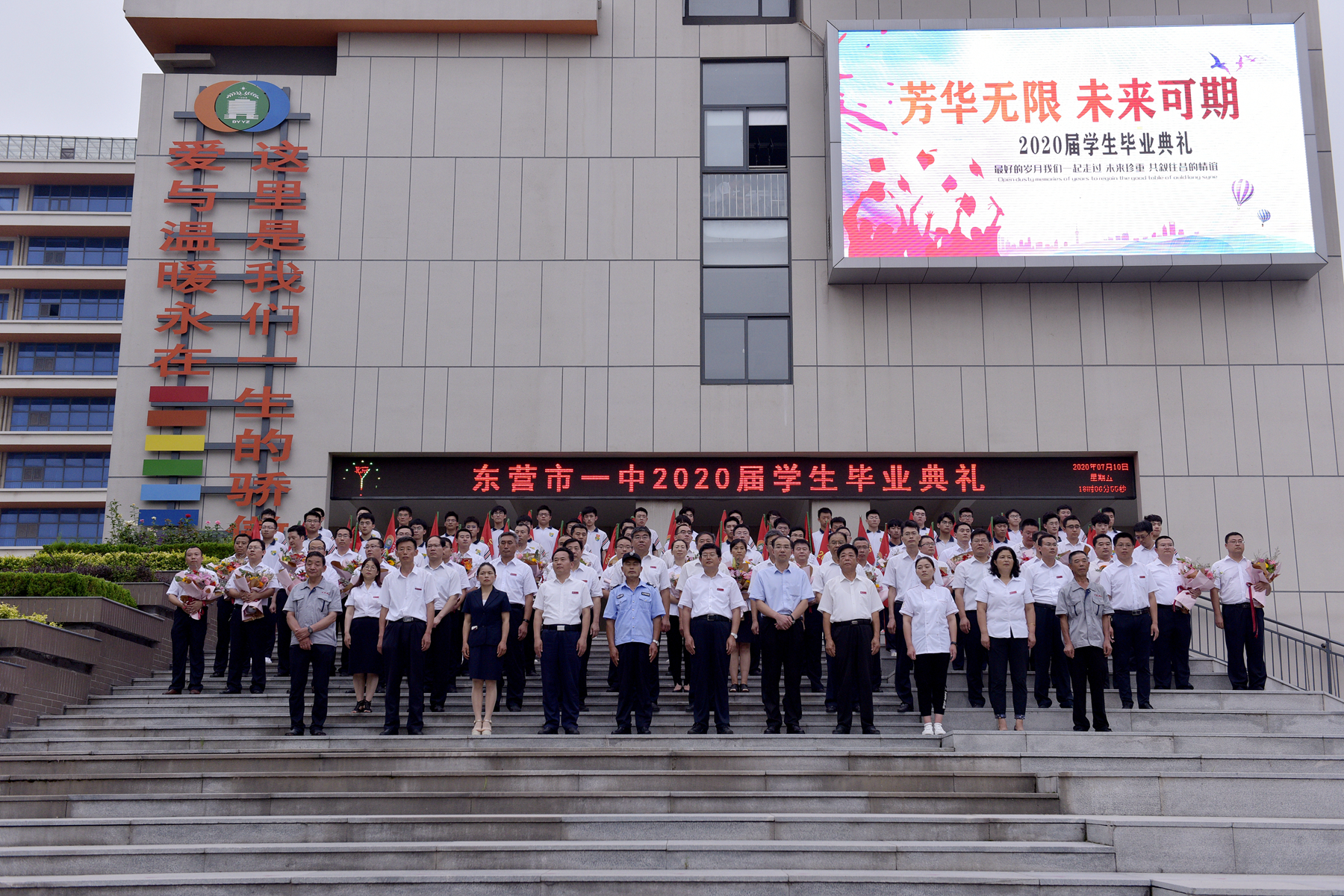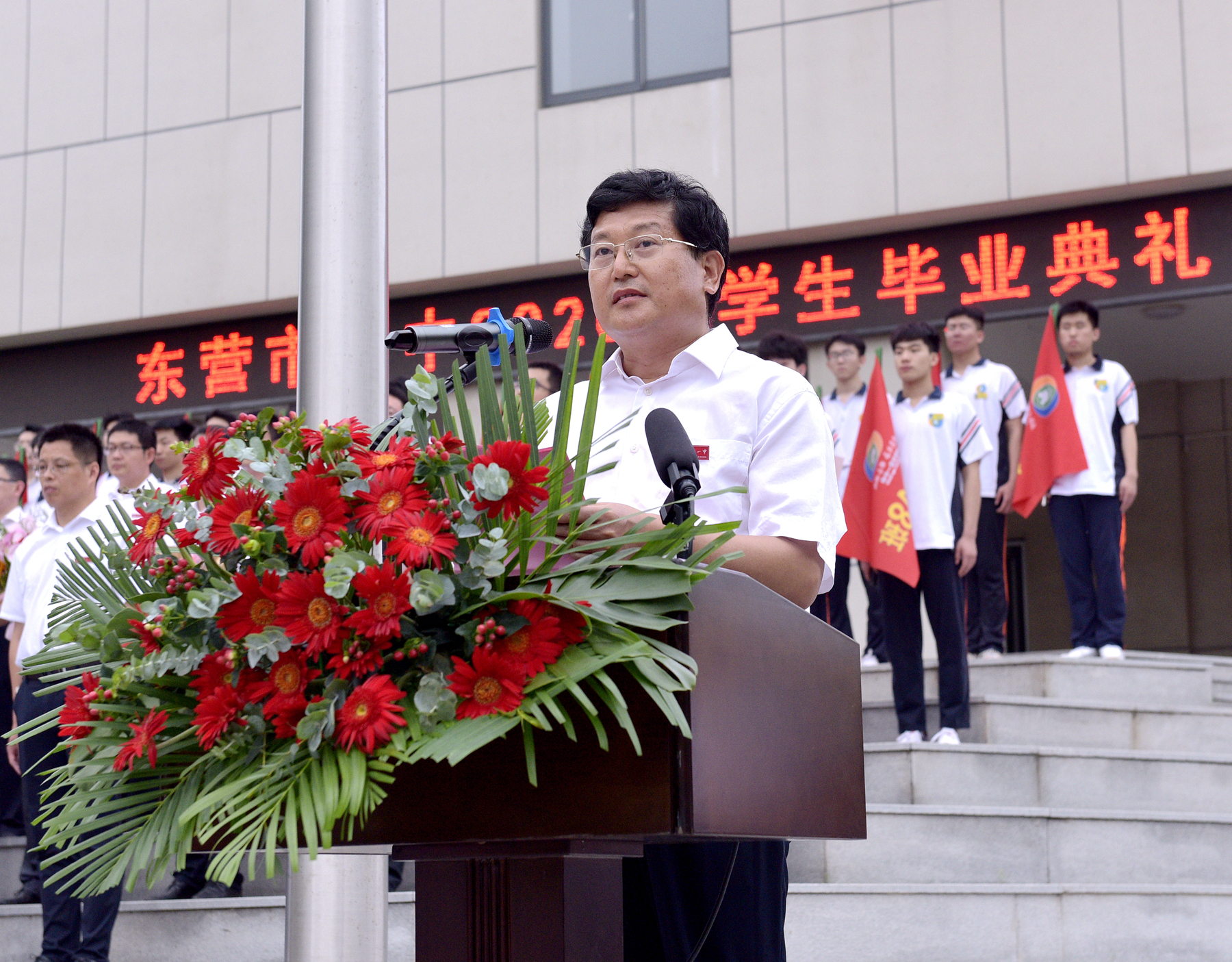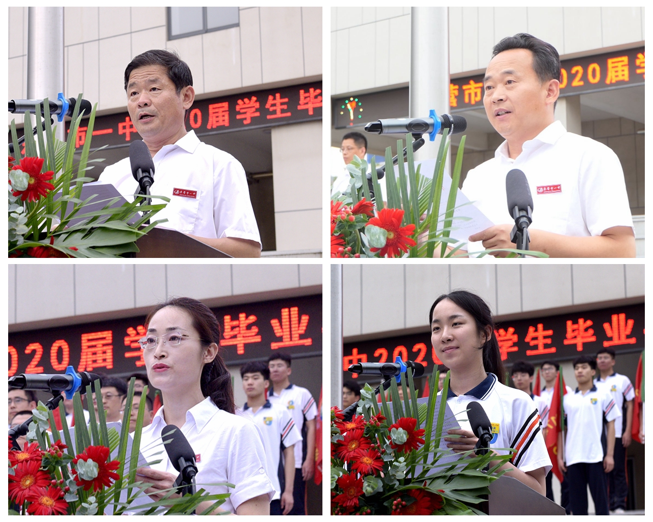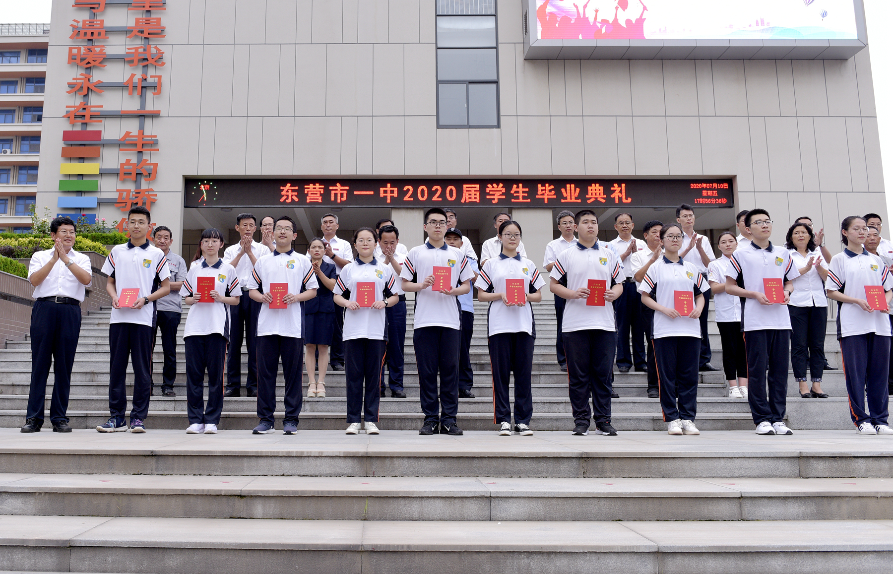 毕业典礼在雄壮的国歌声中拉开帷幕。副校长董玉奎宣读了《东营市一中关于准予2020届毕业生毕业的决定》,史本泉校长为高三毕业生代表颁发了毕业证书。