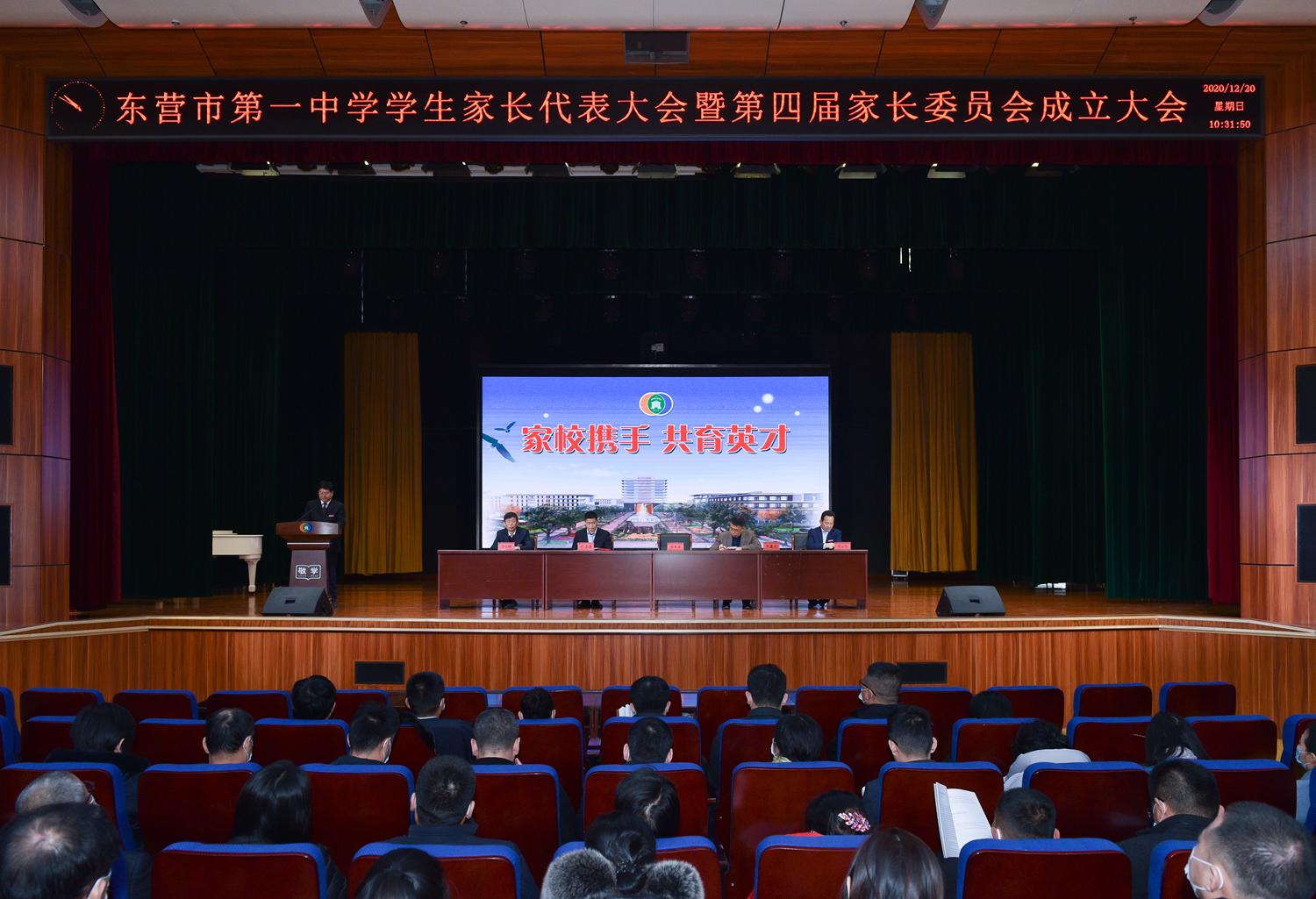 为构建和完善学校、家庭、社会有机结合的教育体系,增强家校联系,促进学校家长委员会工作,12月20日,我校在道德讲堂召开了2020年学生家长代表大会暨第四届家长委员会成立大会。来自三个年级的学生家长代表共计330余人受邀参加大会,党委书记、校长史本泉、副校长董玉奎、李士刚,学管处主任李新城以及各年级级部主任出席大会。副校长董玉奎主持会议。