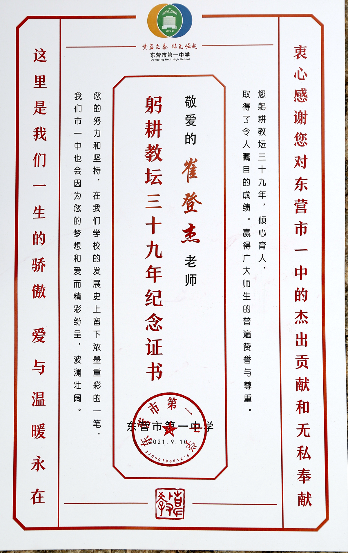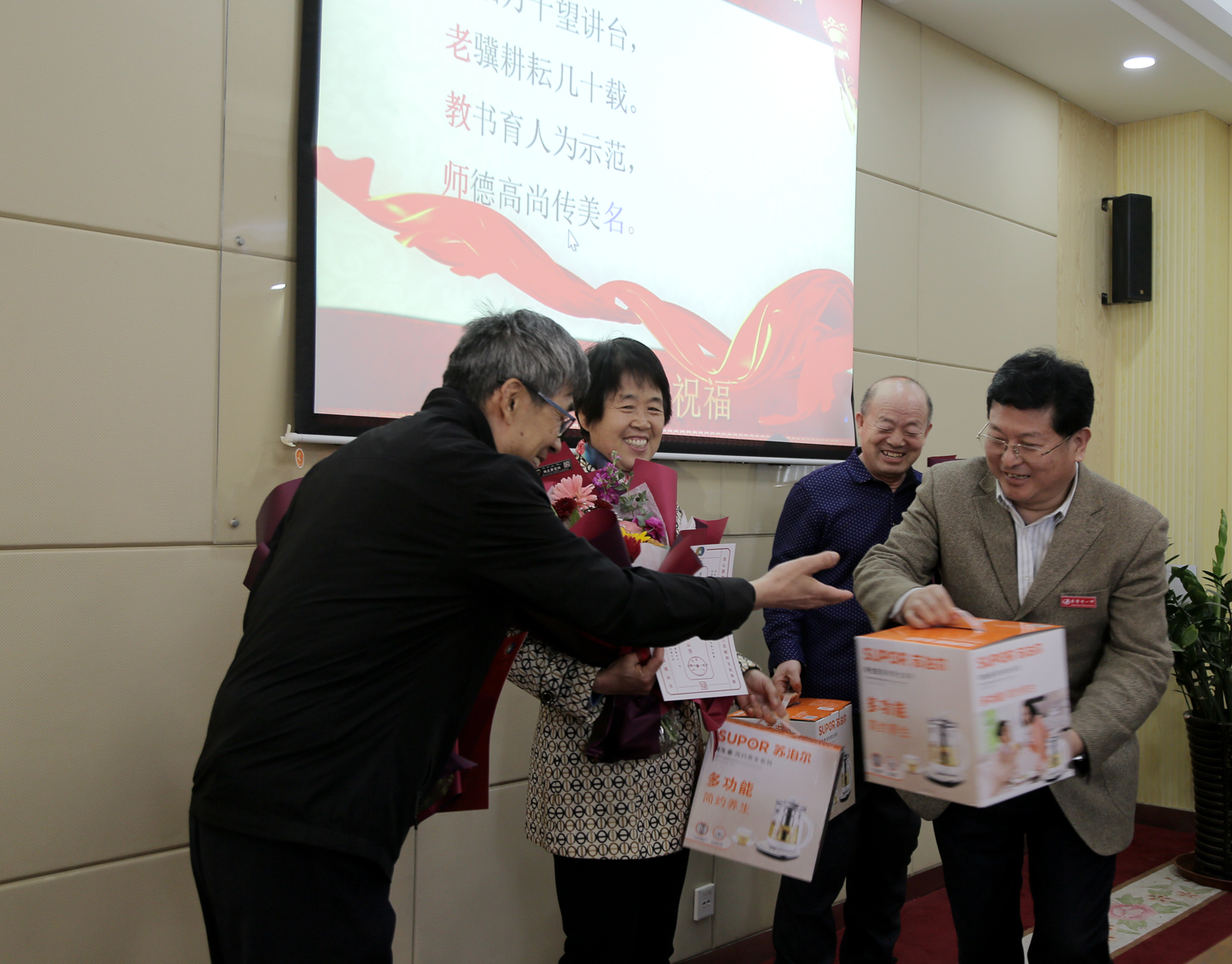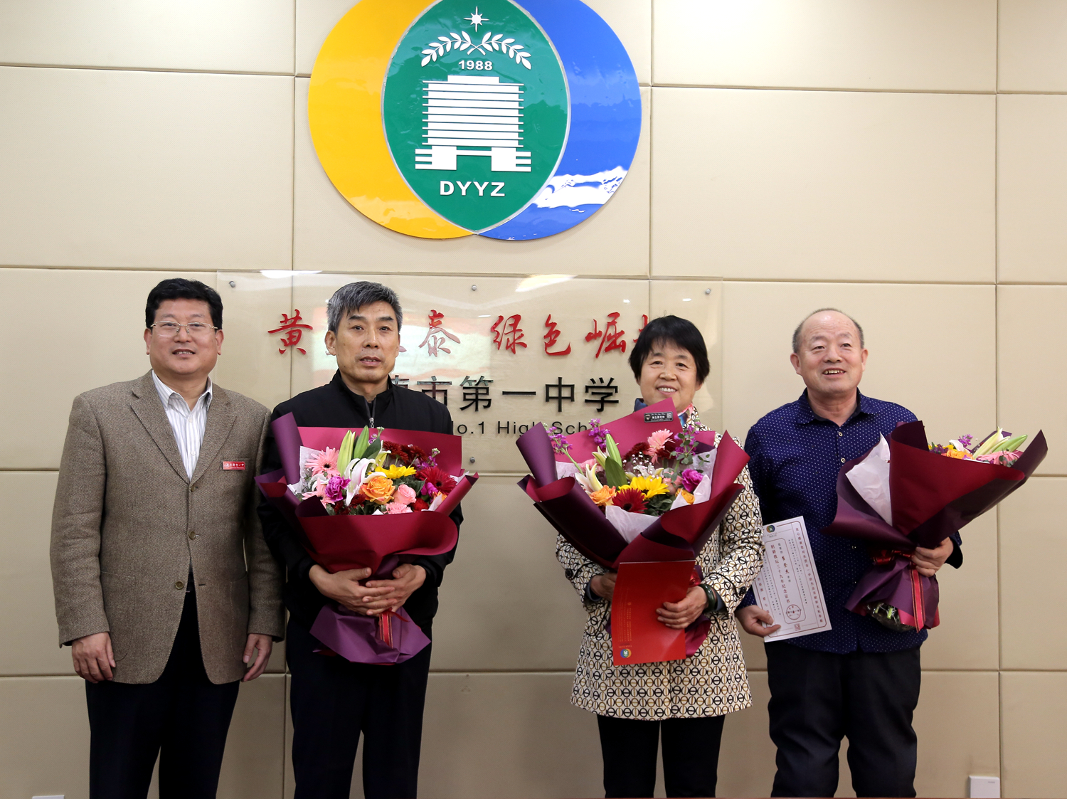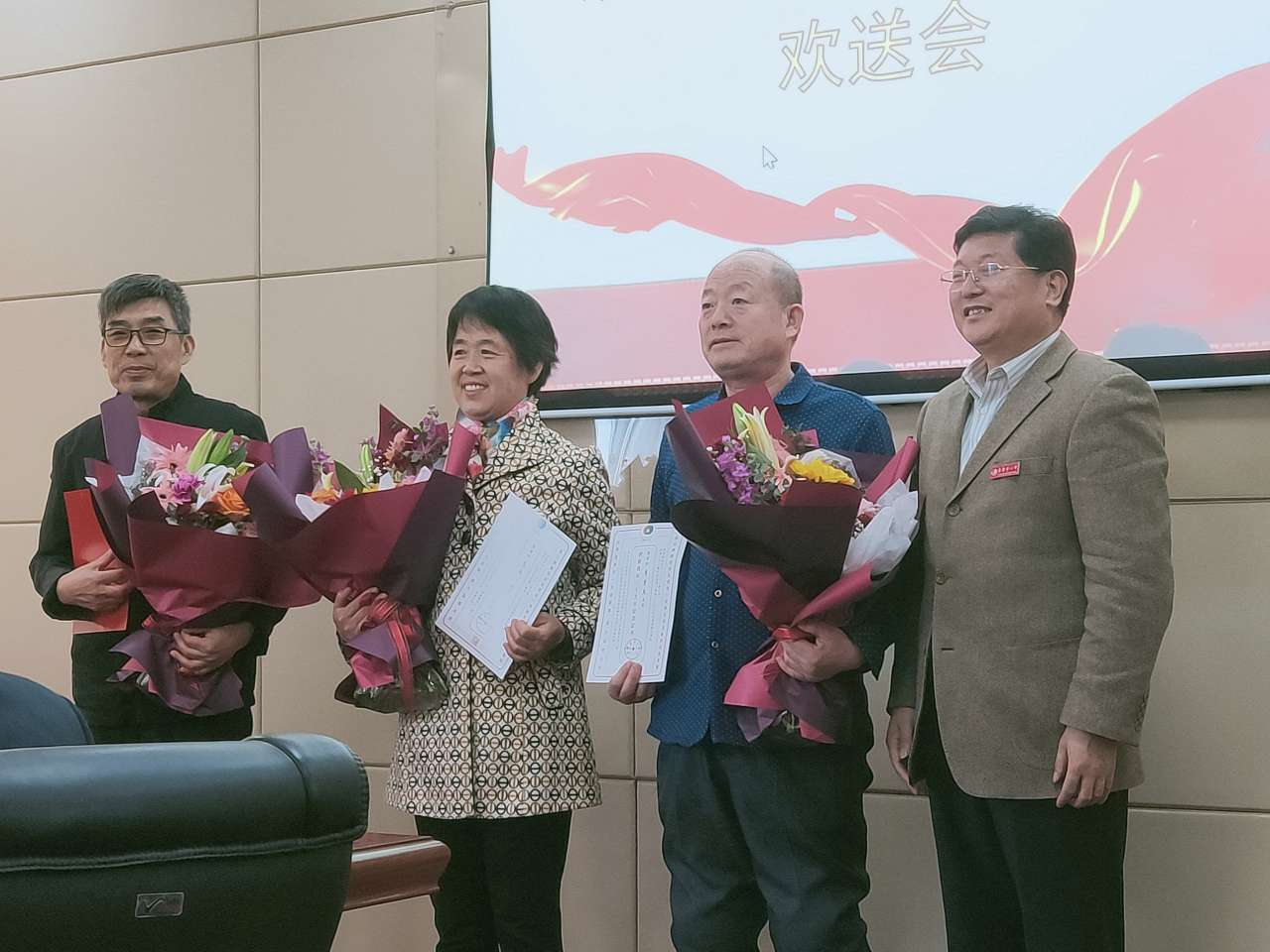 最后,伴随着《驼铃》宛转悠扬的音乐,史本泉校长为退休教师颁发光荣退休证书和纪念品,并献上鲜花合影留念。