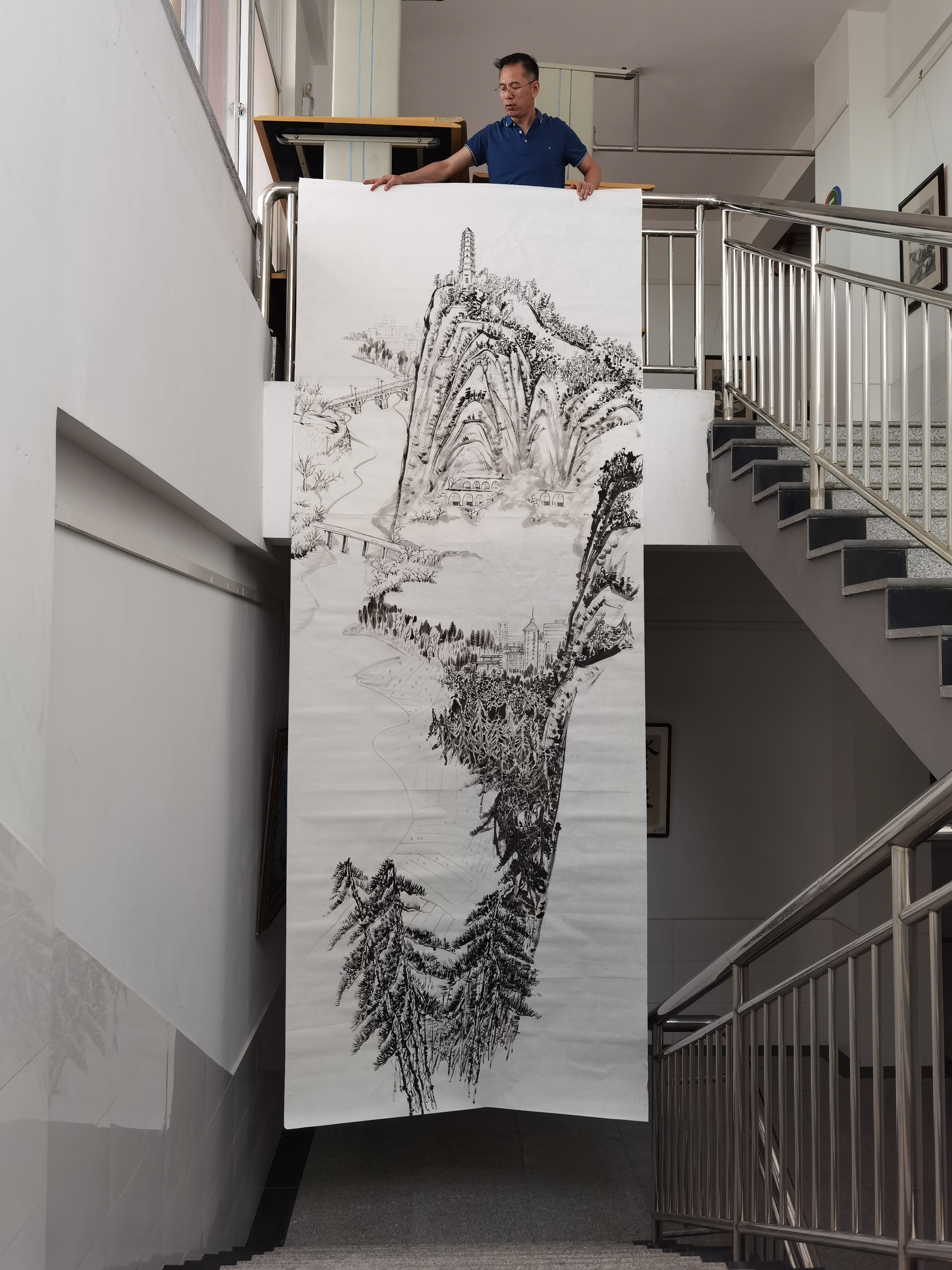 这幅巨型山水画《革命圣地延安》,宽2米,高4米。画作上,青松苍劲,宝塔凌云,延河水平静流淌,延河桥雄伟壮观,自然风貌与人文景观浑然一体,相映成辉。画作以暖色为主色调,表现出圣地延安在太阳映照下一派宁静祥和、成熟收获之美。