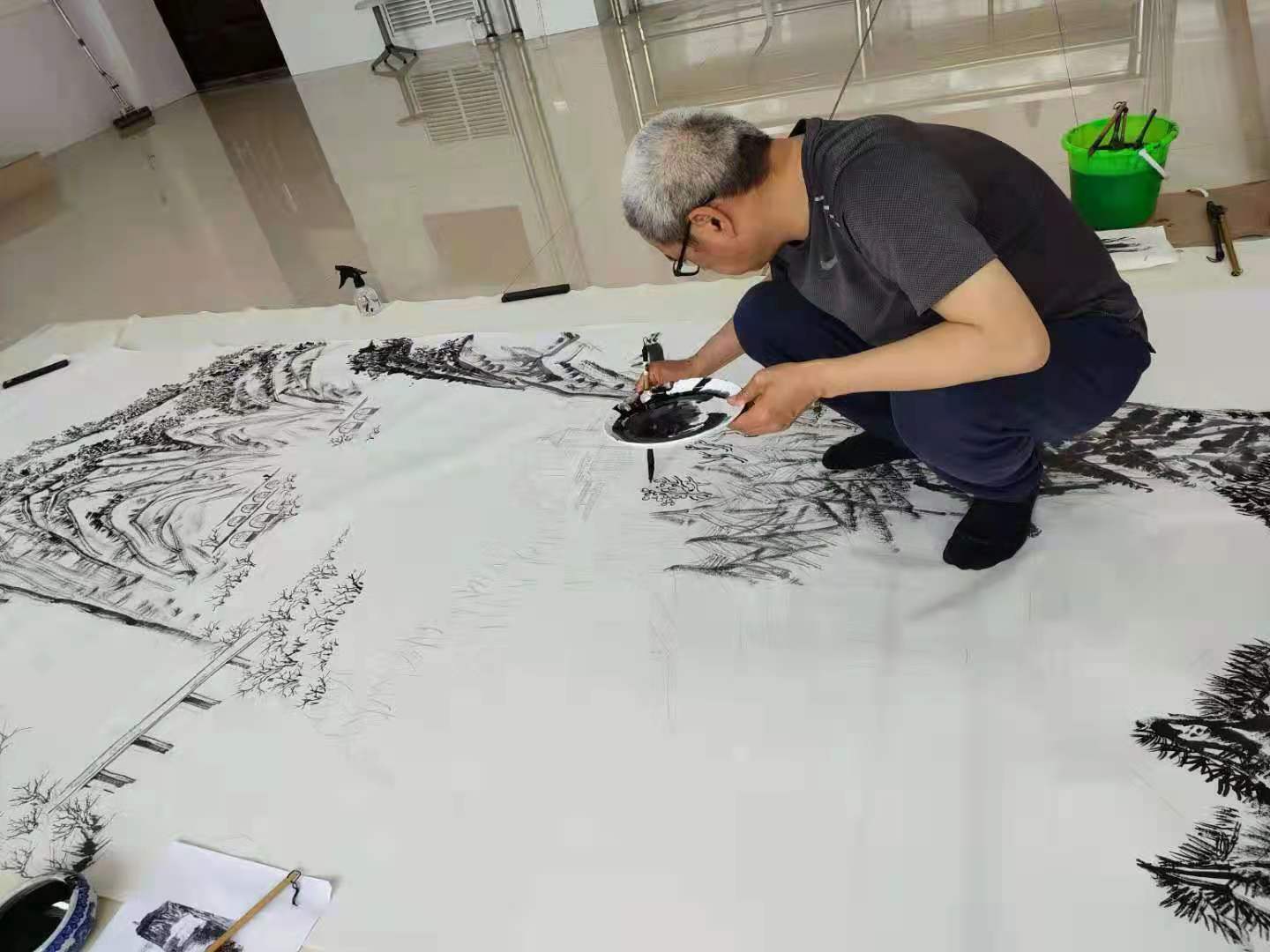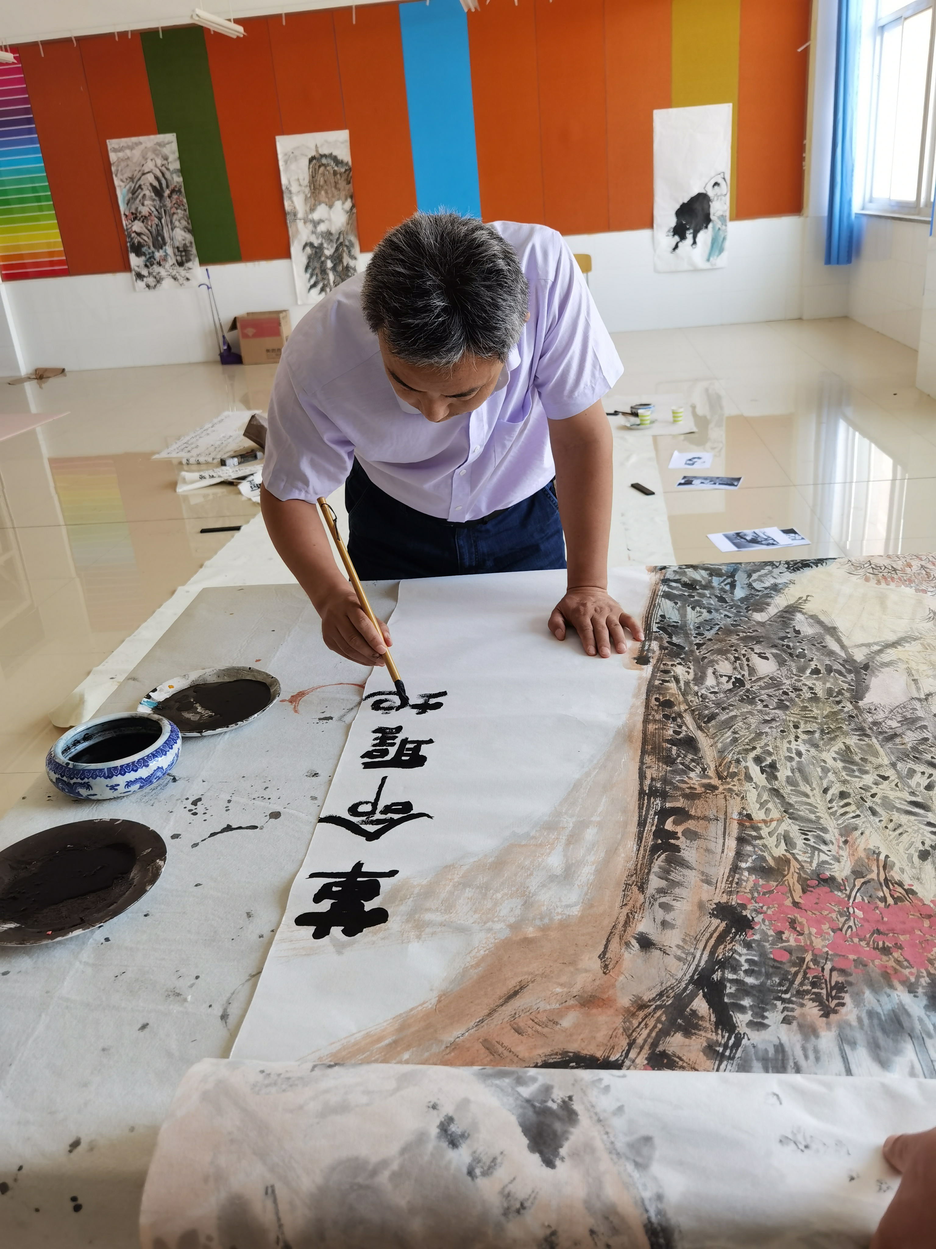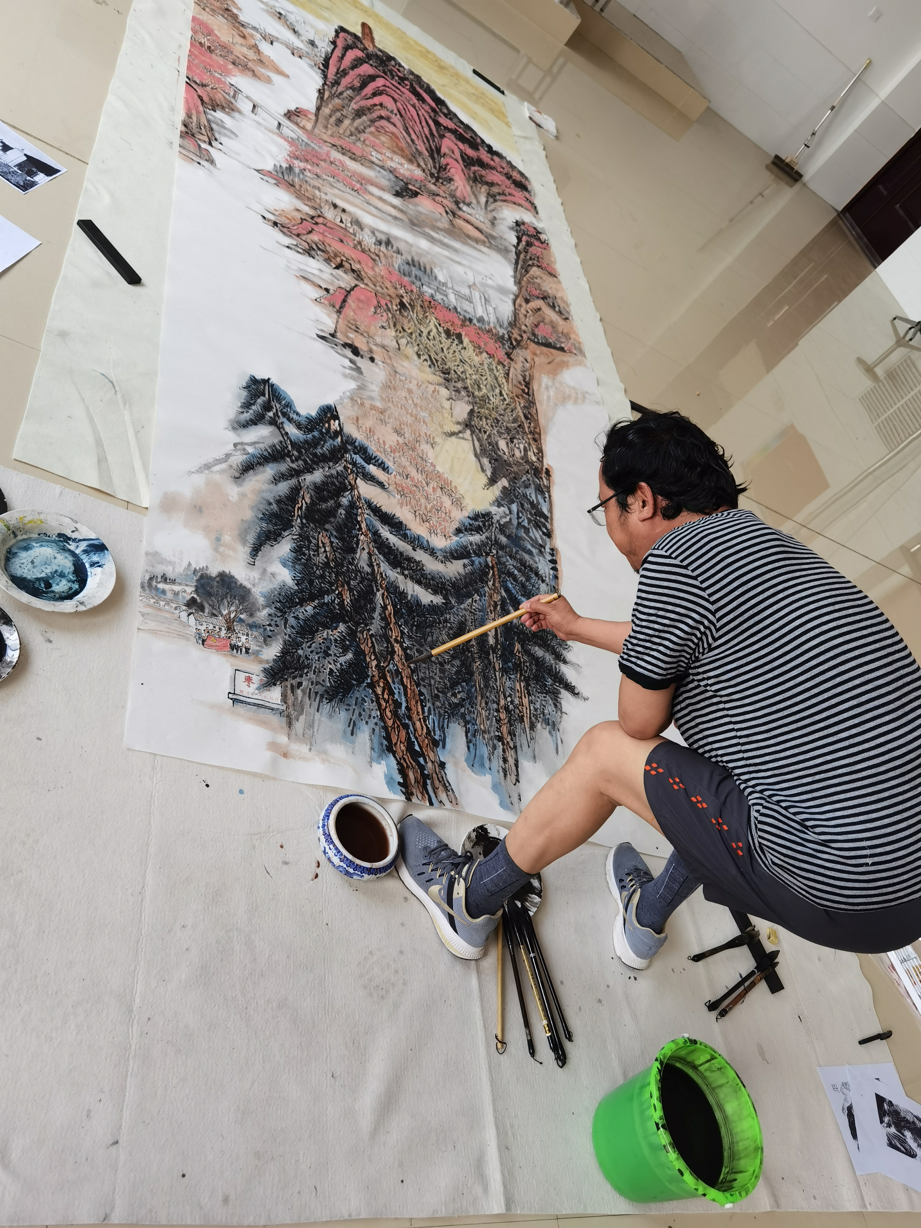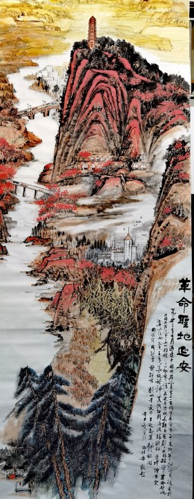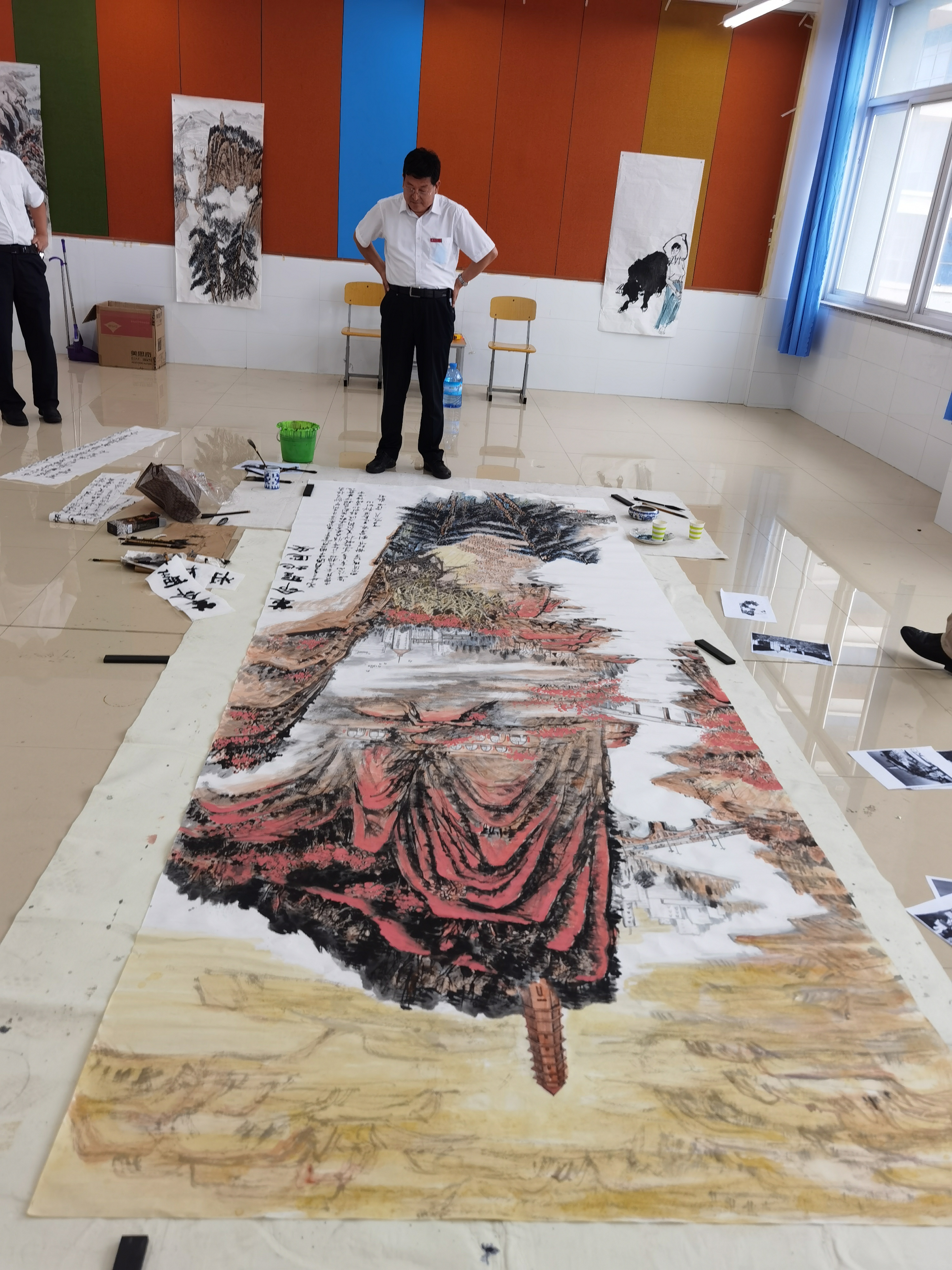 公元2021年7月,适逢中国共产党成立100周年。史本泉校长委托学校美术组,绘制一幅大型山水画向建党百年献礼。美术组全体老师经过认真讨论,一致同意选择革命圣地延安作为描绘对象。