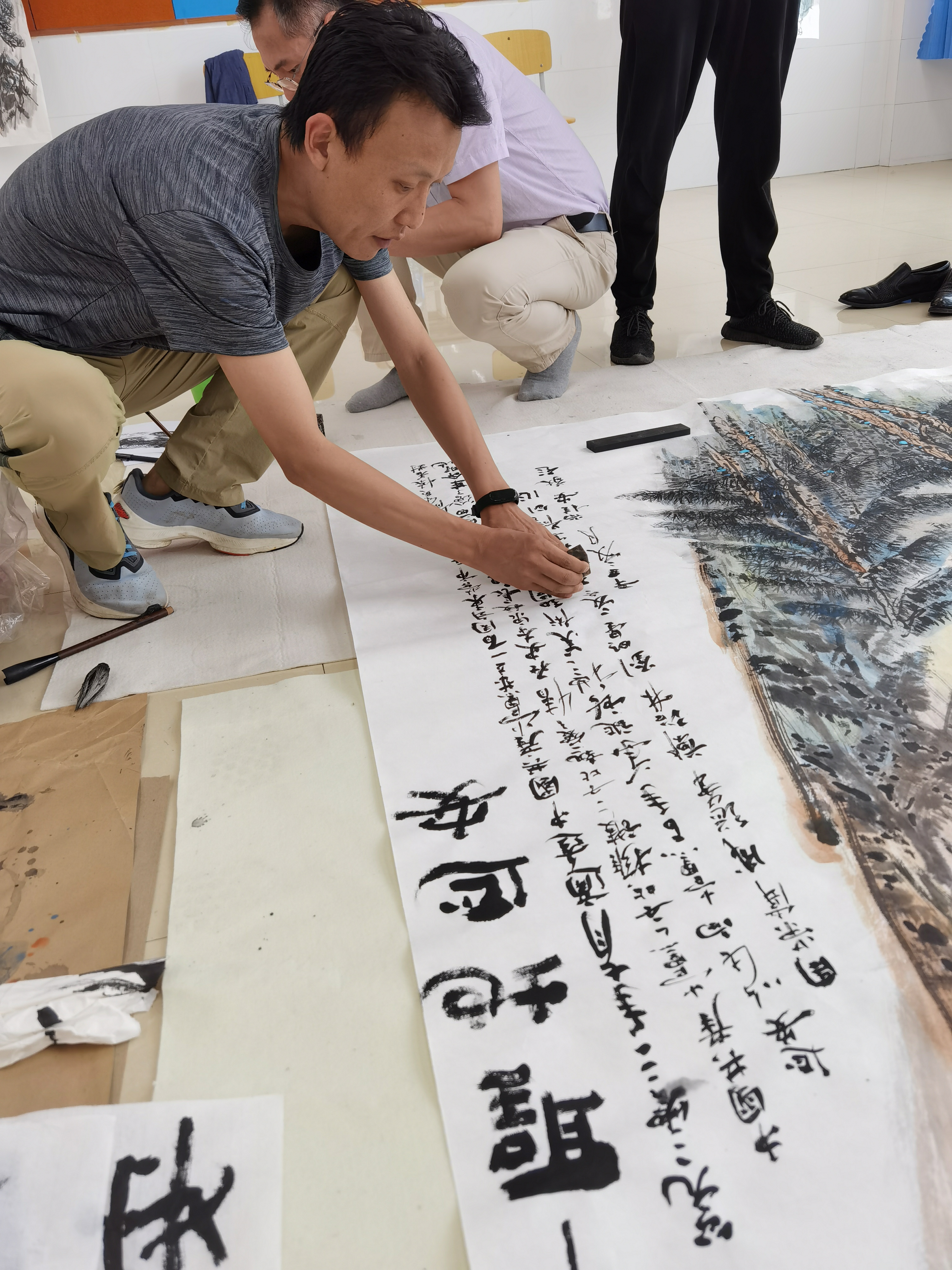 这次创作是美术组第一次尝试绘制大型作品,虽然时间紧,任务重,但美术组全体教师怀着对党的无比拥护无比热爱之情,克服困难,加班加点,终于比预定时间提前两天完成了这幅巨制。