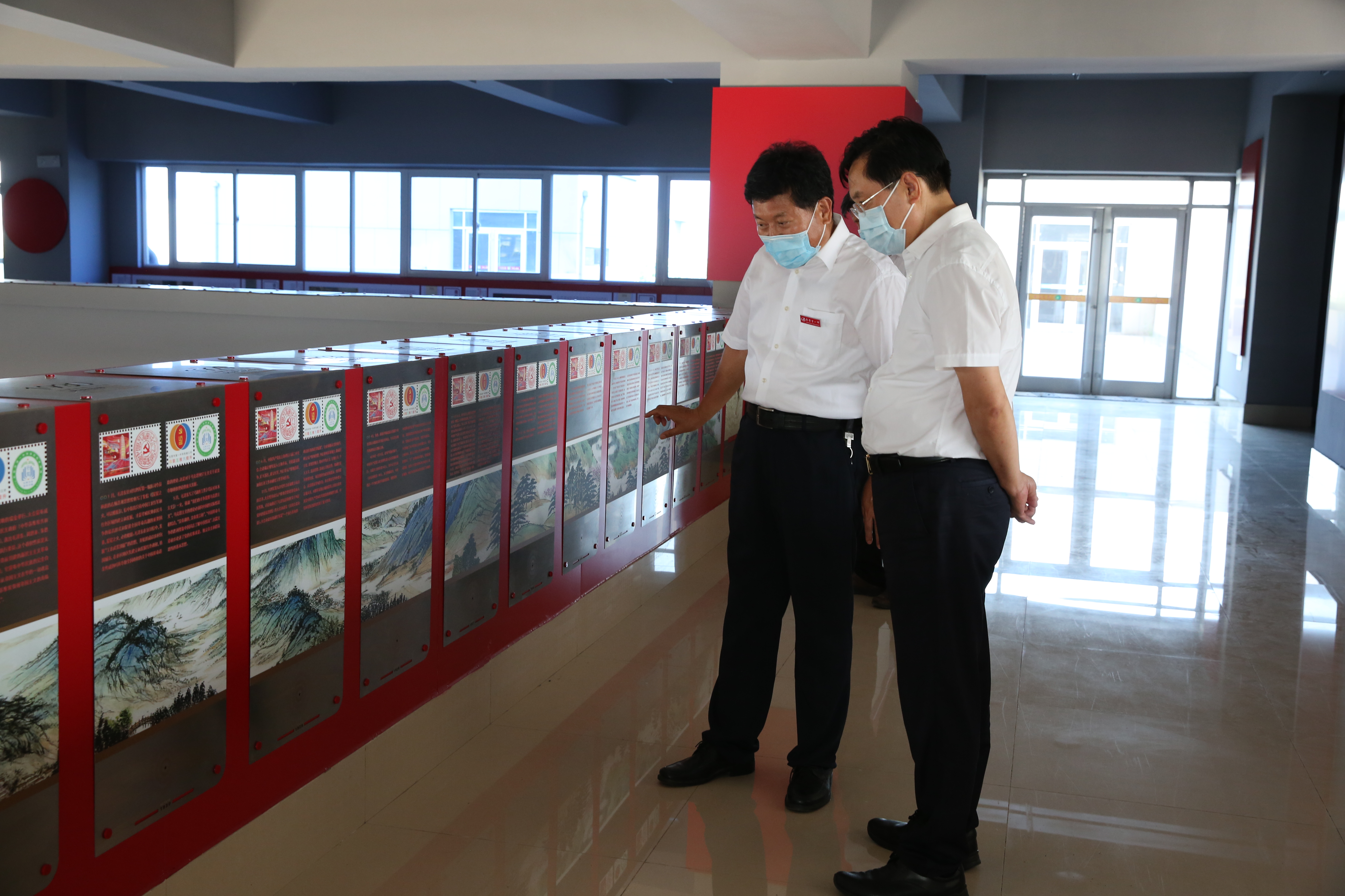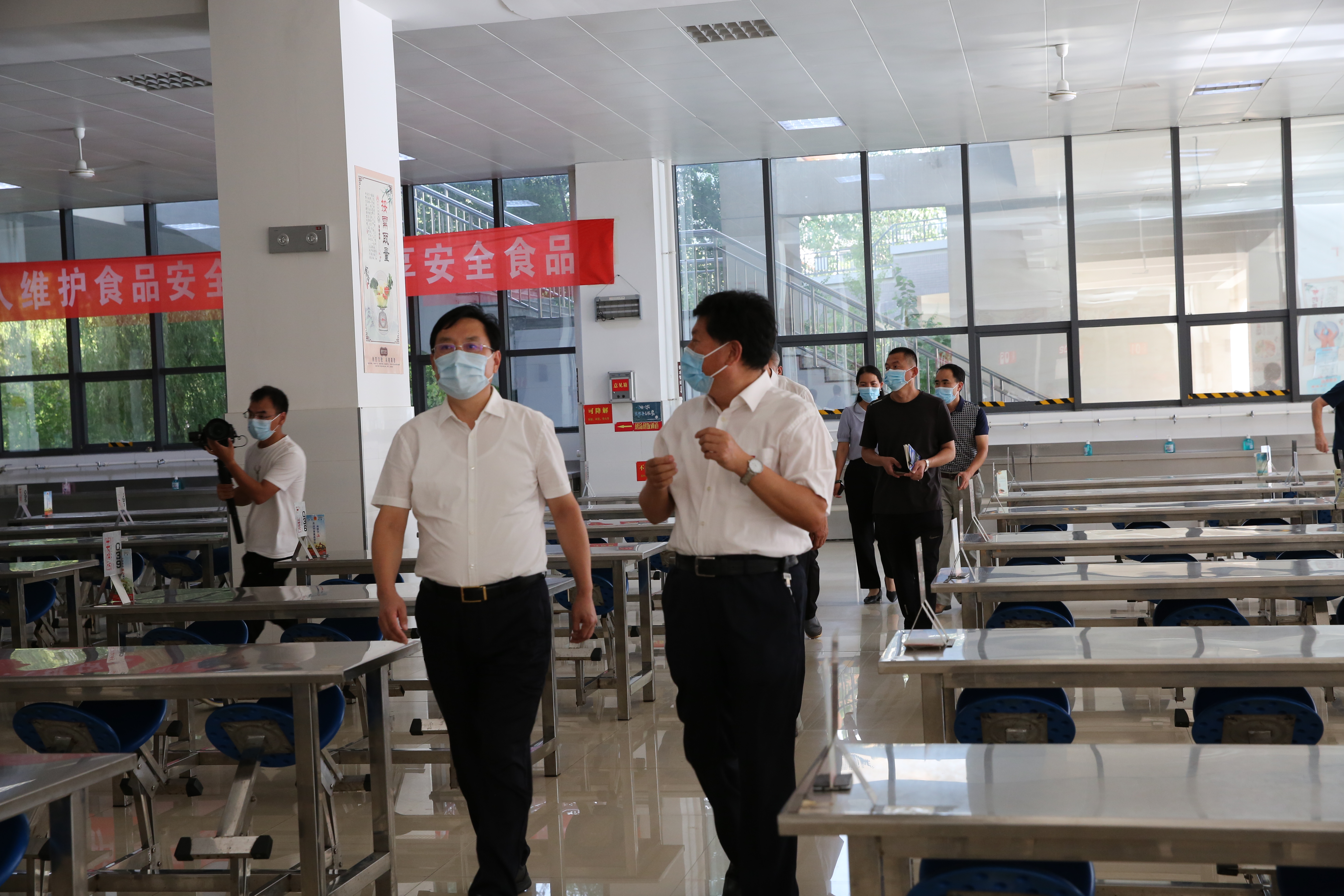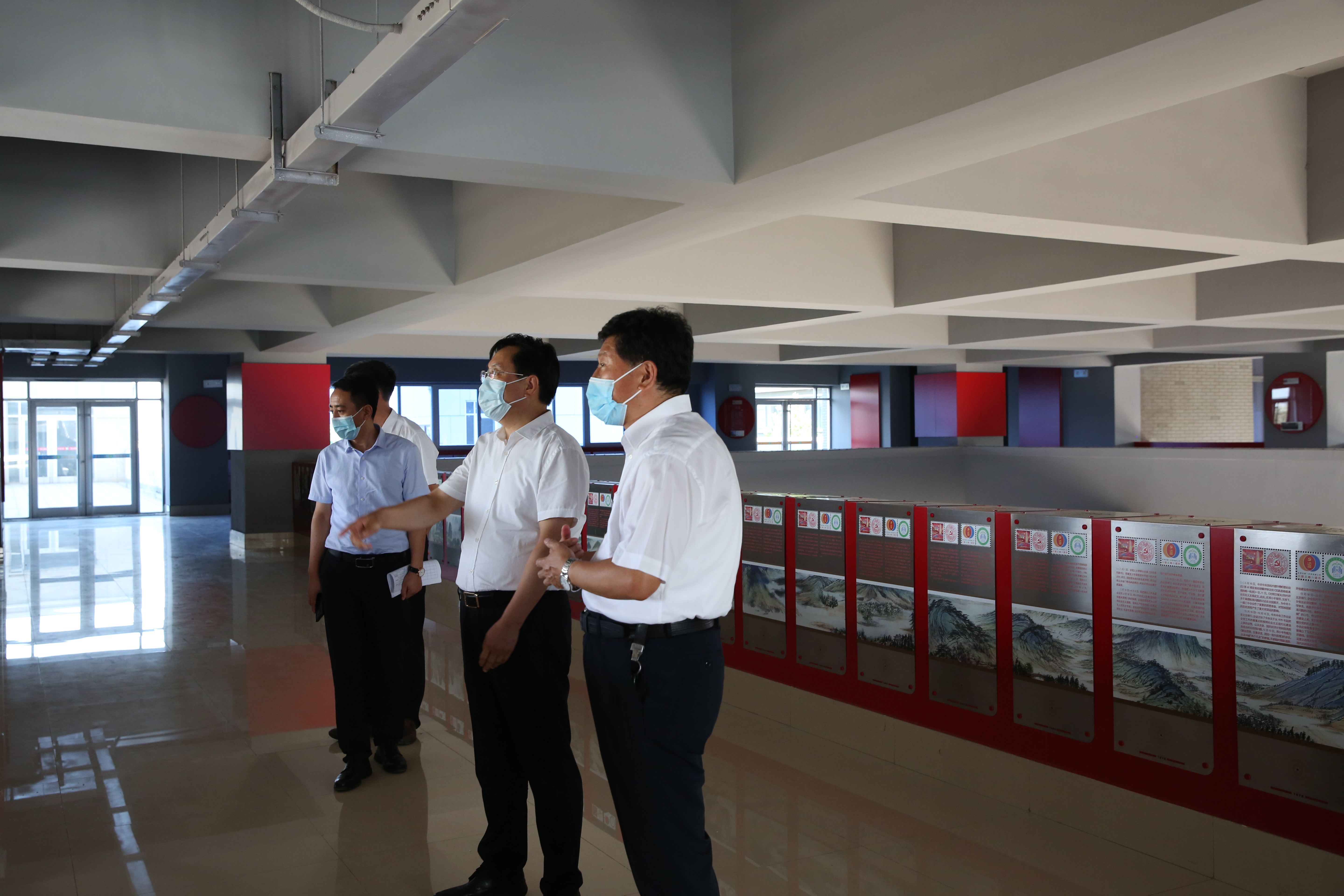 孙红军局长在史本泉校长的陪同下,实地察看了入校体温检测点、物资储备室、留观室、教室和食堂等场所,详细了解了学校防疫物资储备、食堂就餐安排等有关情况,参观了学校党史长廊,并到建设工地了解学校游泳馆建设情况。